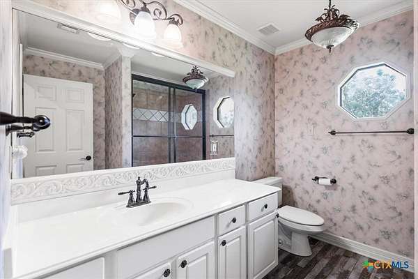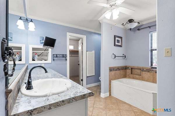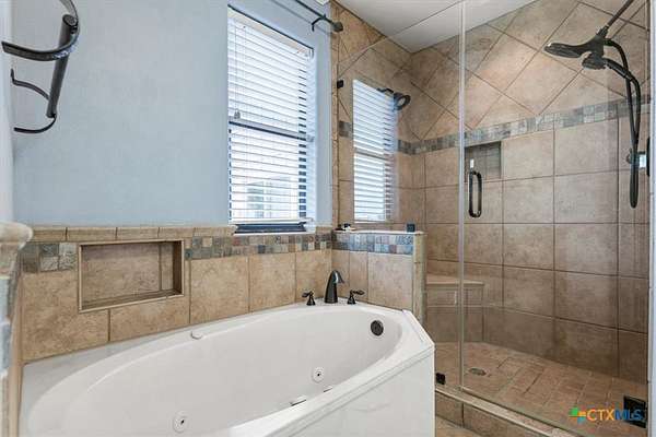- Bookcases, Built In Features, Ceiling Fans, Crown Molding, Dry Bar, Garden Tub Roman Tub, High Ceilings, Jetted Tub, Living Dining Room, Multiple Living Areas, Natural Woodwork, Open Floorplan, Pull Down Attic Stairs, Recessed Lighting, Separate Shower, Skylights, Split Bedrooms, Vanity, Walk In Closets, Window Treatments