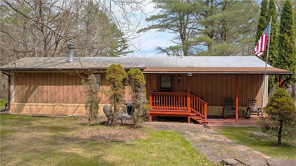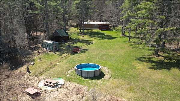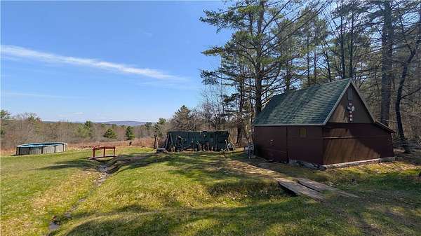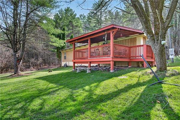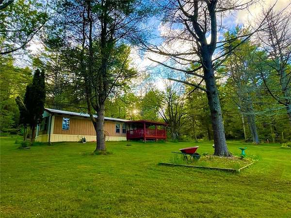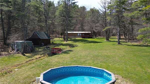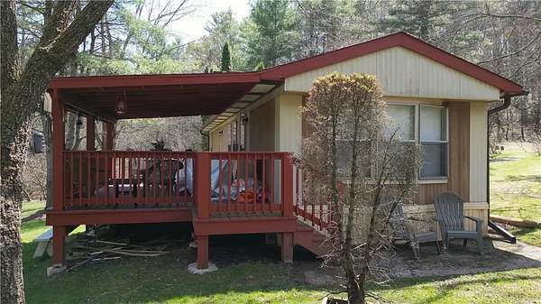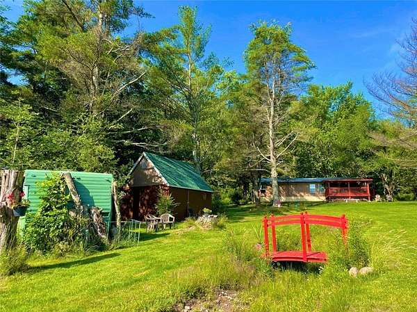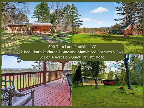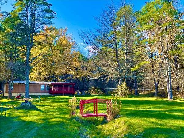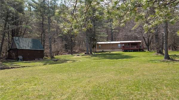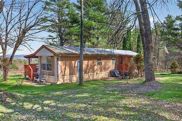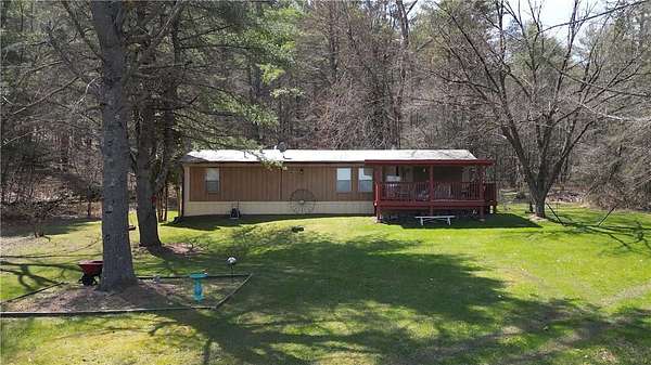 This property is basically the ultimate cozy getaway - comprised of a tastefully updated 1990 manufactured home, covered front and back decks, large storage shed/barn, ample lawn space, trails into the back meadow and on into the pristine woods - it really packs many desirable features in one 4 acre parcel on a quiet, private road. Entering from the roadside, a fresh gravel parking area leads to a bluestone walkway, past the fire pit, and into the covered front entry deck. Inside, a spacious living room with wood burning fireplace and new laminate flooring is open to the kitchen and dining areas. A hallway with laundry nook and full bath with updated vanity then leads to the larger bedroom. The opposite end of the home has a second bedroom with mini-bay window looking out to the small side patio. Exit the living room to the huge covered back deck, which faces easterly with stunning distant views over the meadow and woods behind the home. A super well manicured lawn includes recent drainage work to manage natural moisture, areas for gardening and recreation, and even has an above ground pool. The shed is spacious for a workshop or storage for lawn equipment and toys. A trail system leads back through a delightful meadow and into some woods, passing a seasonal stream towards a rustic campsite near the back of the property. Systems updates include new 200 amp service to the pole (100 amp to the house), new water heater and pressure tank, exterior skirting and gutters, septic leach lines, and shed roof. There is so much to consider here, it has all the vibes! All just minutes from the village of Franklin, 20 minutes to Oneonta (and All Star Village), under 10 minutes to I-88 access, and 2:45 to metro NY.