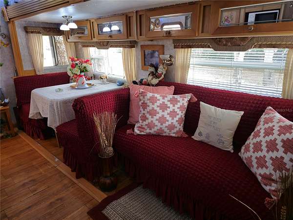 Perfect CORNER LOT in active and friendly residential gatedcommunity with lots of amenities. This desired CORNER LOT includes a recreational vehicle, great for short or long term rent. Also a separate screened enclosedporch (built 2021) and 2 sheds. Sold fully furnished. The lot is fenced with separate areas for relaxation and a large secured area for parking. All furnishings in the trailer, screened porch and sheds will stay. The oversized shed includes a Washer & Dryer and a 2 door Refrigerator. The trailer includes 1 bed/1 bath, dining & sitting area, kitchen w/range, refrigerator & microwave.The community amenities include pool, kiddie pool, playground, basketball, mini putt-putt golf courses, shuffleboard and horse shoes. TheHOA fee includes water, sewer, trash, and leaf pickup. There is a Trading Post/Market at the front of the park for convenience items and hot food.Laundry & Pool houses around including a community center/clubhouse. The association hosts lots of activities, includingbingo, and holiday meals. Short term rentals are allowed.Clarcona Resort is a self sustained neighborhood with itsown private sewer and water systems. Gate staff personnel monitors the main entrance to the park 24 hours a day. Great location with lots of dining & shopping. Major roads nearby for easy commute. Definitely a great investment opportunity!
