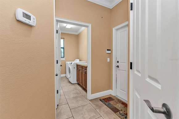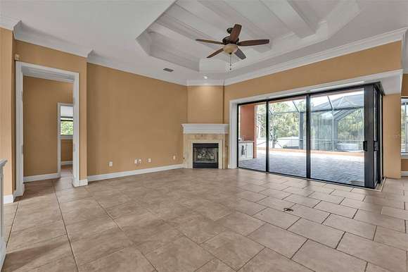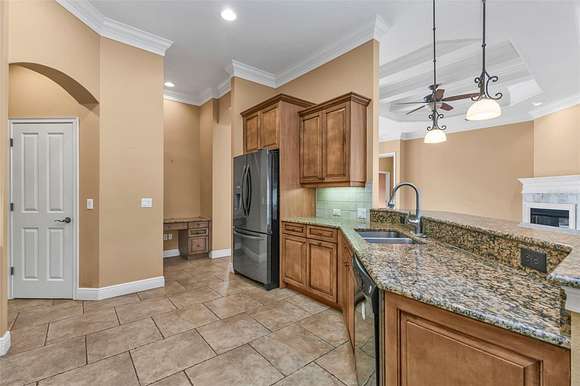 The living room features a coffered ceiling, a gas fireplace adorned with travertine tile, and a custom mantle. The laundry room is both functional and stylish, with ample counter space and a built-in sink.