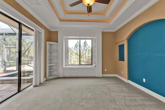 Step into the primary suite, where luxury and privacy meet. Highlights include a spacious walk-in closet with built-in shelving, a charming built-in window seat, ambient lighting in a tray ceiling, and artful niches. Sliding glass doors provide direct access to the expansive lanai. The spa-like en suite bathroom offers a garden tub, walk-in shower with serene nature views, solid wood cabinetry, and granite countertops.
