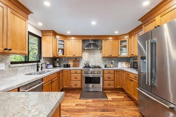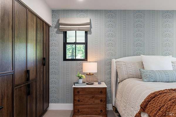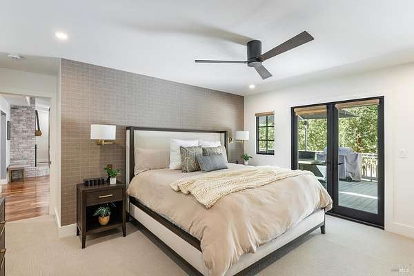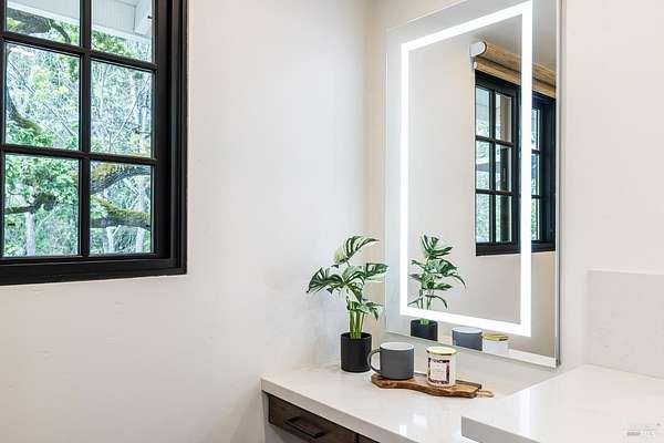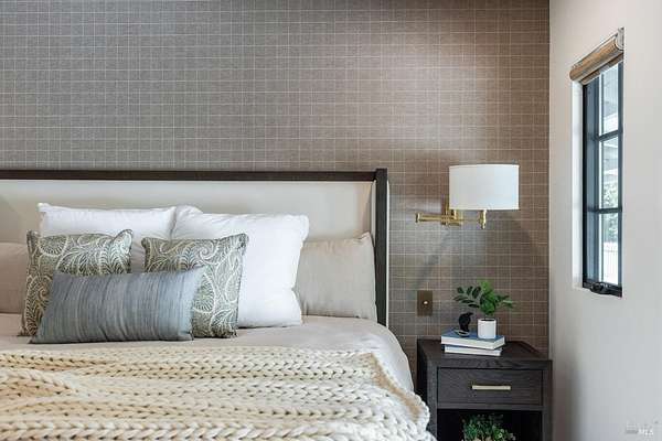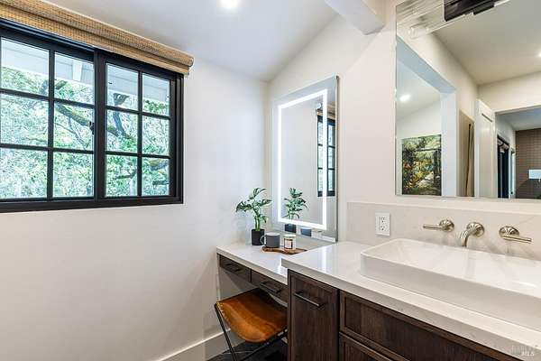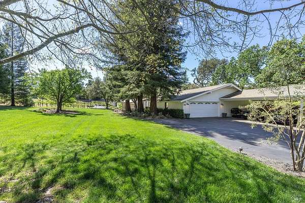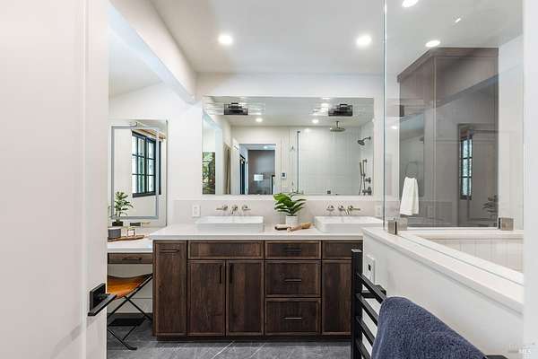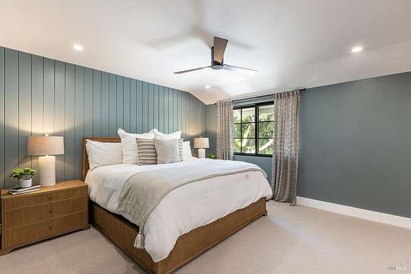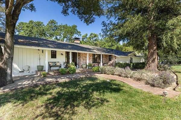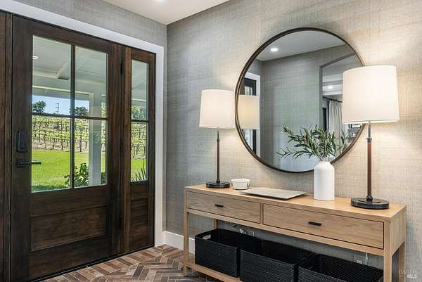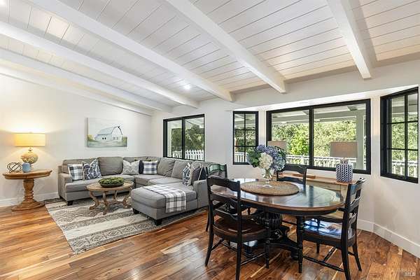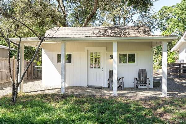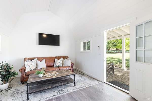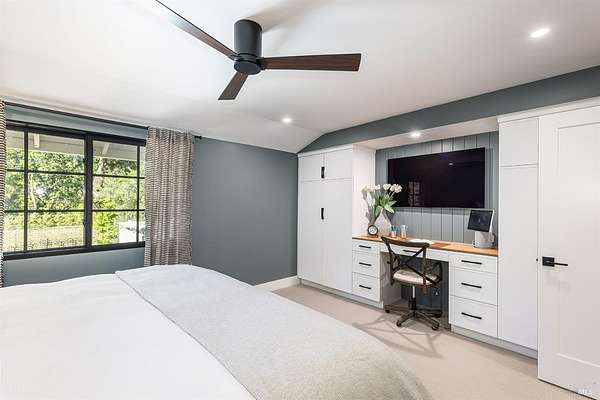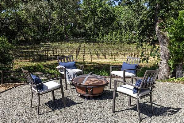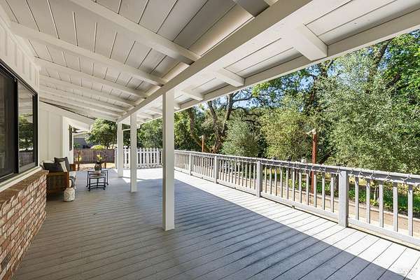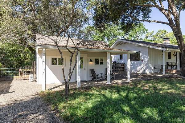 Enchanting Napa Valley Retreat on Silverado Trail with Vineyard Views Ideally located on the iconic Silverado Trail, directly across from Burgess Cellars and just one mile from Silverado Country Club, this beautifully updated single-level Modern Farmhouse offers the quintessential Napa Valley lifestyle with stunning views both from the front of the home and across the expansive backyard. A manicured walkway leads past a stately front lawn and mature trees to a striking new front door, where a heated brick entry welcomes you inside. The entryway has been thoughtfully opened up with elegant arched doorways, creating a light-filled and inviting introduction. Inside, Acacia wood floors, exposed beam ceilings, updated recessed lighting, modern ceiling fans, and curated light fixtures create a warm yet refined aesthetic. The open-concept kitchen features granite countertops and recently updated stainless steel appliances, flowing seamlessly into dining and living spaces. The private primary suite offers a peaceful retreat with French doors opening to the expansive deck, a custom walk-in closet, and a beautifully updated spa-inspired shower. Throughout the home, significant enhancements by NV Design include custom cabinetry, updated bathrooms, and a cohesive material palette featuring rich dark soapstone and dark-framed windows with elegant coverings. The dining room showcases built-ins and an expanded picture window, while the guest bedroom features custom cabinetry and designer wallpaper. Additional improvements include new doors, added windows, updated electrical panels, and recently serviced septic and well systems. A detached casita with its own views provides flexible space for a home office, gym, or guest accommodations. The laundry/mud room includes a built-in dog wash station for added convenience. Designed for indoor-outdoor living, the backyard features a spacious composite deck overlooking one of the property's most special highlights your own half-acre Cabernet vineyard along with a bocce ball court, tranquil creek, and mature oak and olive trees. A rare opportunity to own a turnkey Napa Valley retreat combining elevated design, vineyard living, and views in every direction.