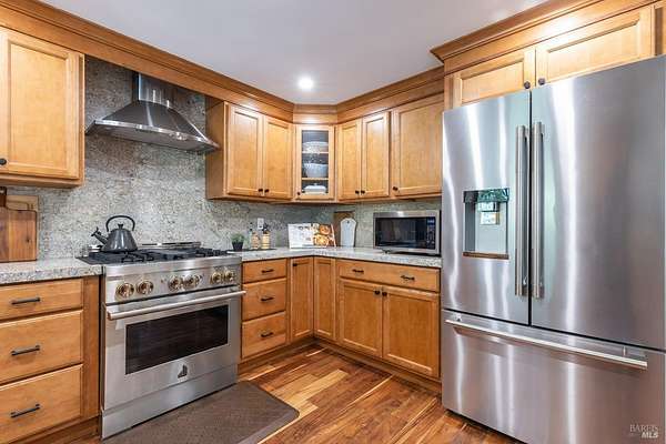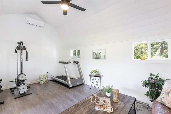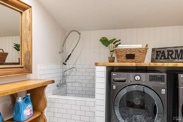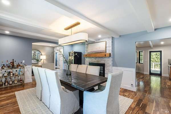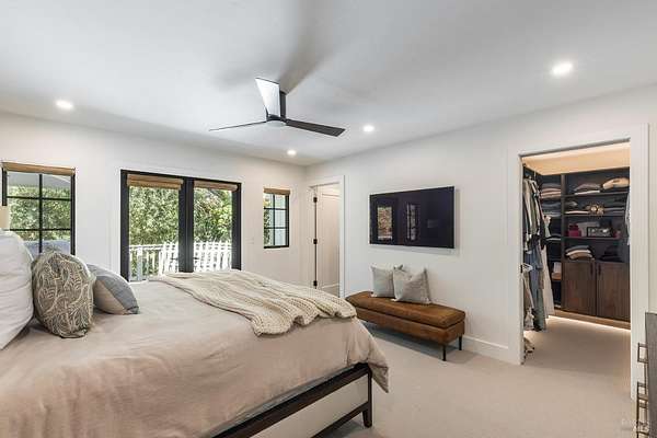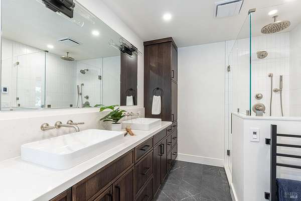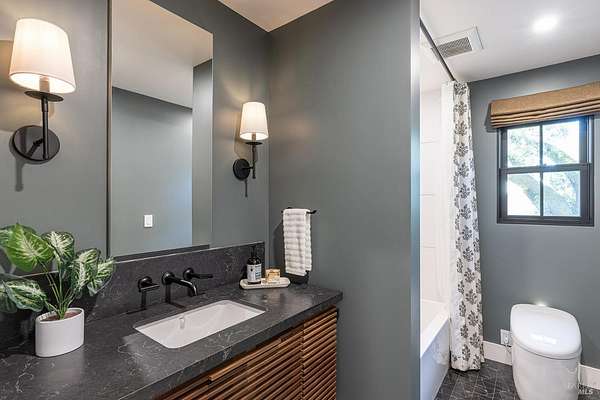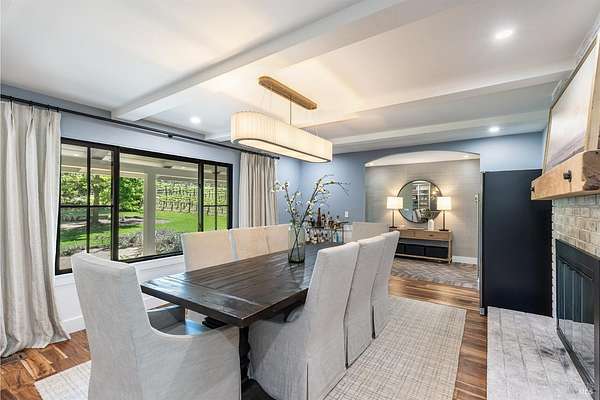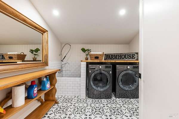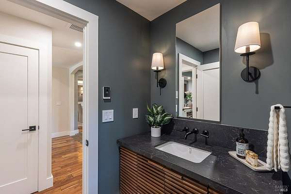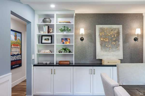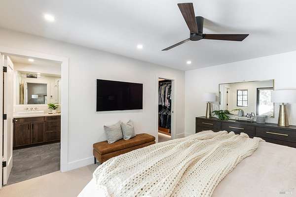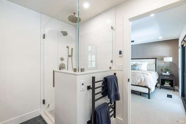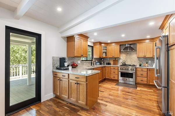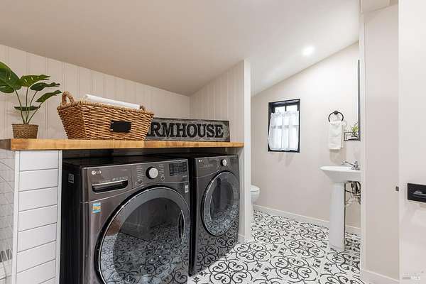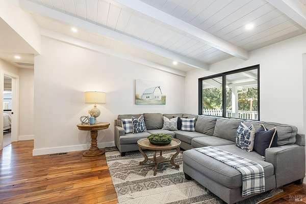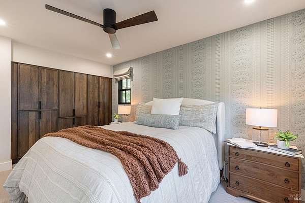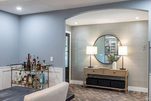 Enchanting Napa Valley Retreat on Silverado Trail with Vineyard Views Ideally located on the iconic Silverado Trail, directly across from Burgess Cellars and just one mile from Silverado Country Club, this beautifully updated single-level Modern Farmhouse offers the quintessential Napa Valley lifestyle with stunning views both from the front of the home and across the expansive backyard. A manicured walkway leads past a stately front lawn and mature trees to a striking new front door, where a heated brick entry welcomes you inside. The entryway has been thoughtfully opened up with elegant arched doorways, creating a light-filled and inviting introduction. Inside, Acacia wood floors, exposed beam ceilings, updated recessed lighting, modern ceiling fans, and curated light fixtures create a warm yet refined aesthetic. The open-concept kitchen features granite countertops and recently updated stainless steel appliances, flowing seamlessly into dining and living spaces. The private primary suite offers a peaceful retreat with French doors opening to the expansive deck, a custom walk-in closet, and a beautifully updated spa-inspired shower. Throughout the home, significant enhancements by NV Design include custom cabinetry, updated bathrooms, and a cohesive material palette featuring rich dark soapstone and dark-framed windows with elegant coverings. The dining room showcases built-ins and an expanded picture window, while the guest bedroom features custom cabinetry and designer wallpaper. Additional improvements include new doors, added windows, updated electrical panels, and recently serviced septic and well systems. A detached casita with its own views provides flexible space for a home office, gym, or guest accommodations. The laundry/mud room includes a built-in dog wash station for added convenience. Designed for indoor-outdoor living, the backyard features a spacious composite deck overlooking one of the property's most special highlights your own half-acre Cabernet vineyard along with a bocce ball court, tranquil creek, and mature oak and olive trees. A rare opportunity to own a turnkey Napa Valley retreat combining elevated design, vineyard living, and views in every direction.