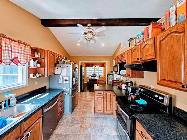 - Beamed Ceilings, Ceiling Fan(s), Double Vanity, Open Floorplan, Vaulted Ceiling(s)