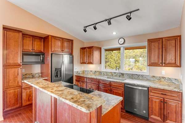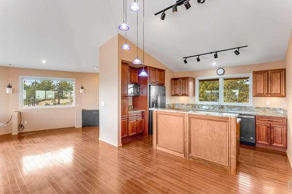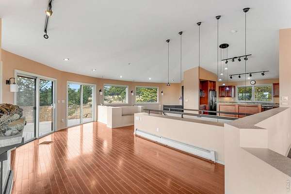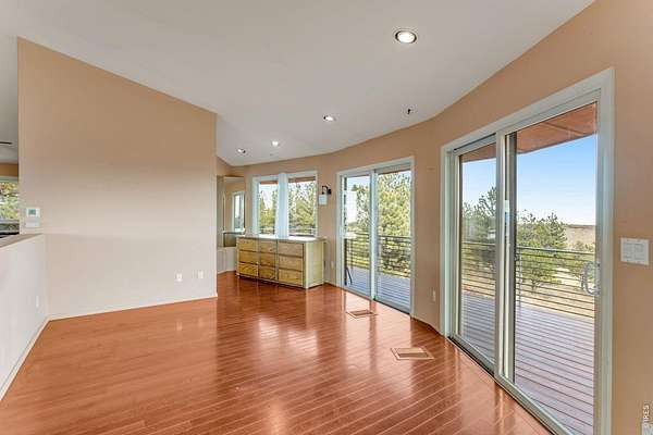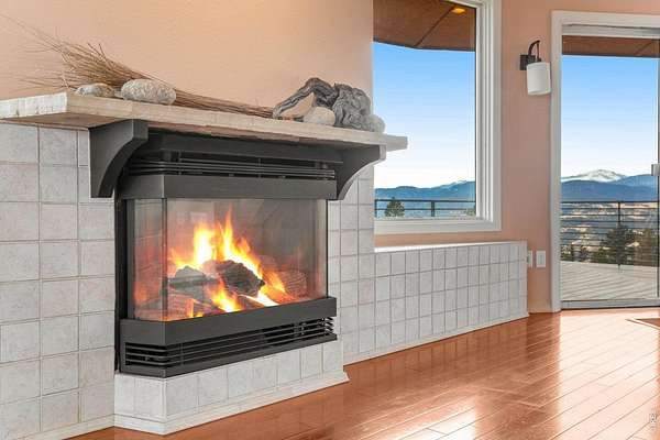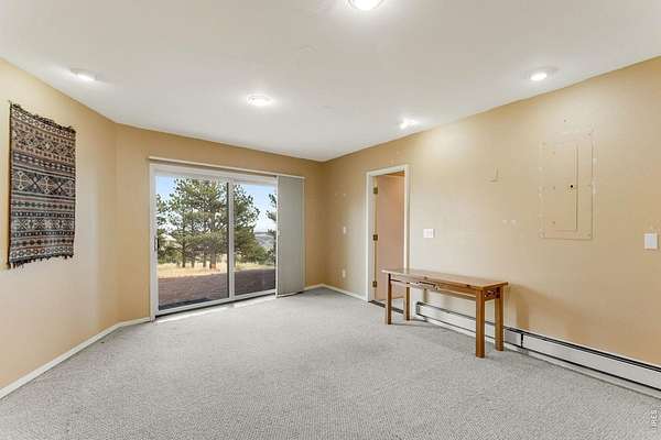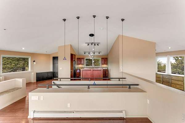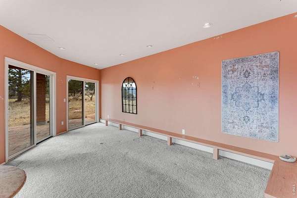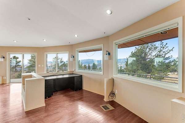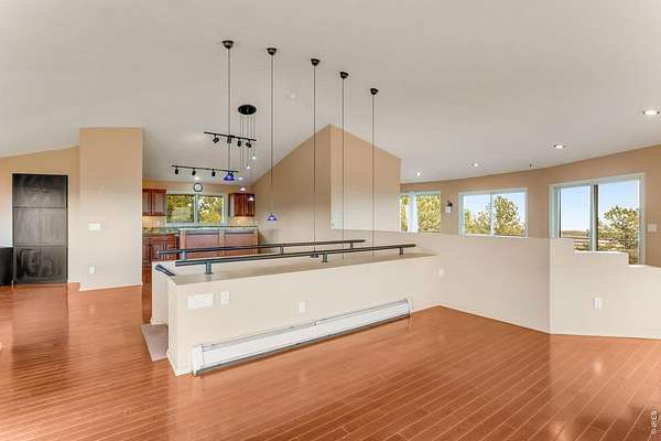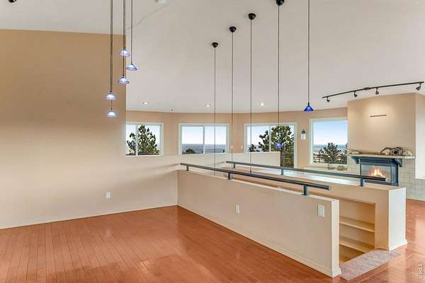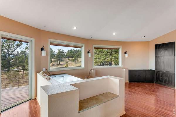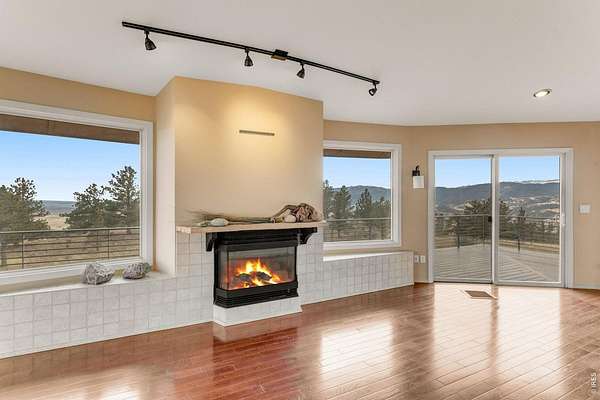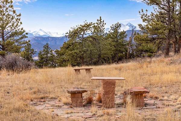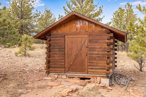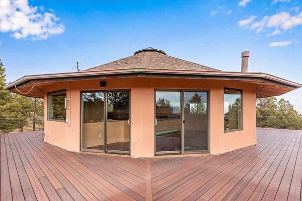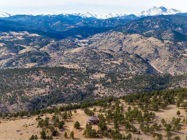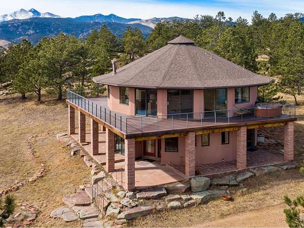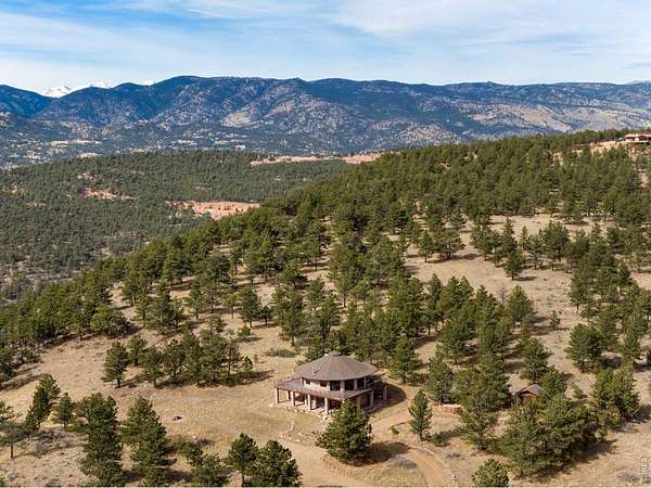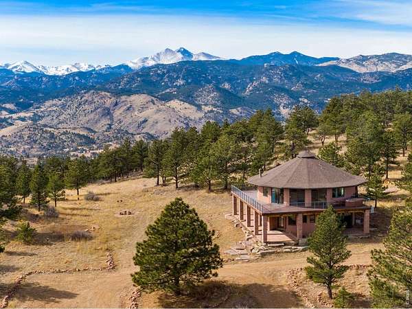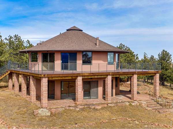 You'll be amazed by this extraordinary architectural gem on 10+ acres in the scenic foothills above the Town of Lyons and overlooking the entire Lyons valley and the mountains beyond, all the way to the Continental Divide. If a spectacular view is your jam, this is the one! This remarkable property stands apart with its 15-sided structure, offering a one-of-a-kind home designed to capture light, views and serenity from every angle. From the moment you enter, you'll appreciate the thoughtful layout and unique form. The entire top floor is open to allow for the 360 view, creating an unparalleled living experience that feels expansive and connected to the landscape. With windows on all sides for fabulous flow-through ventilation, the design brings the outdoors in, bathing the interior with natural light and refreshing breezes year-round. This custom home blends rustic charm with modern comfort, anchored by a soaring central space that is naturally inviting and ideal for both everyday living and entertaining. The open-concept floor plan enhances the circular flow, embracing the panoramic vistas that stretch to the Rocky Mountain peaks and beyond. Outdoors, discover nearly new composite decking that wraps portions of the home, providing durable, low-maintenance outdoor living areas perfect for lounging, dining, or simply taking in the tranquil surroundings. Additional features of the land include unmatched privacy, plenty of relatively flat and quite usable acreage, and abundant solar exposure, mature trees, a sweet 11x10 log studio building, and proximity to natural recreation while still being close to the amenities of Lyons, Longmont and the St. Vrain Valley community. With its blend of distinctive design and dramatic views, this property truly stands out as a rare and special offering! Generac whole house backup generator also included.