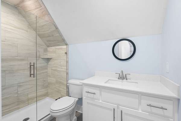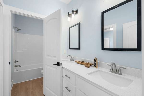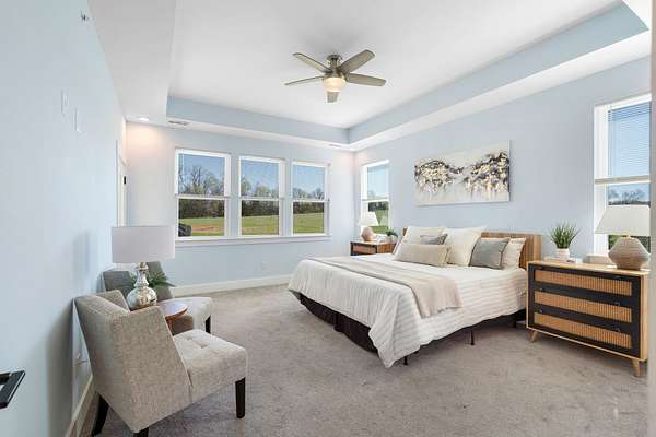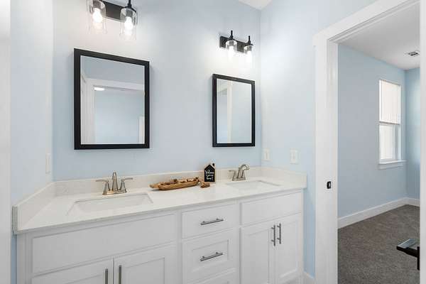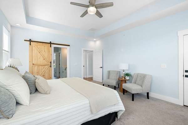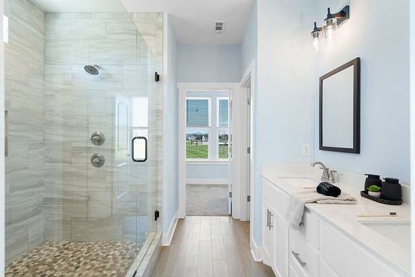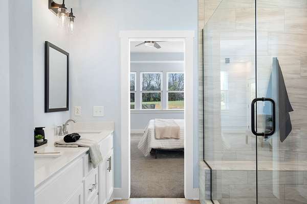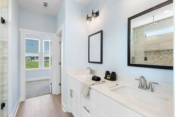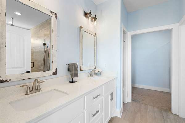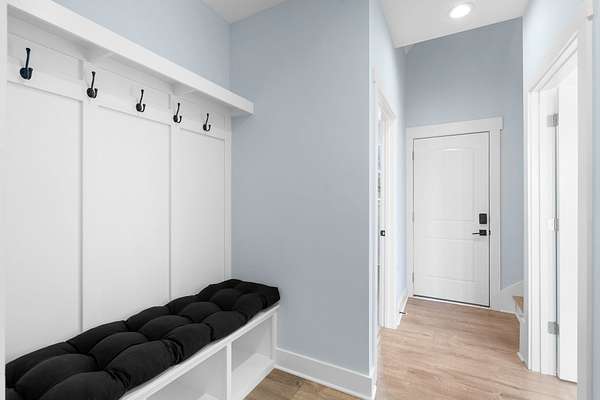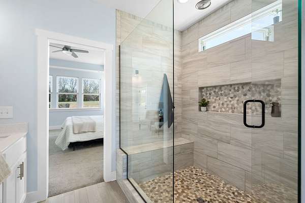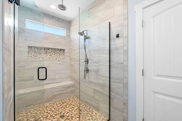 The primary downstairs suites serve as serene retreats, each with modern en-suite bathrooms showcasing dual vanities, sleek finishes, and walk-in tiled showers with glass enclosures and built-in benches. Soft, timeless tones throughout the home provide a neutral backdrop, making it easy to personalize each space. Additional features include a functional mudroom with built-in bench and wall hooks and a bright laundry room with cabinetry and large folding space. A fifth bedroom upstairs could also be used as a home office or playroom and offers a full bathroom with tiled shower w/ glass doors!