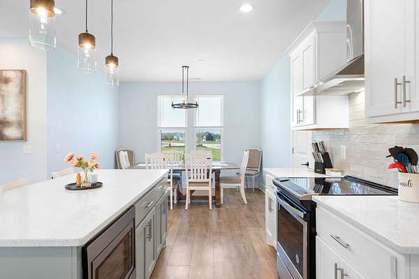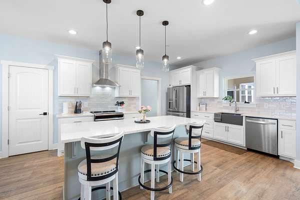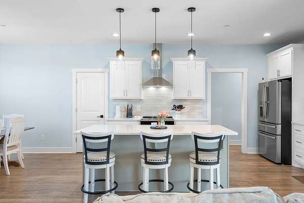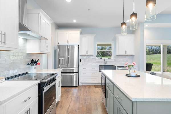 The kitchen is both stylish and functional, featuring quartz countertops, ample cabinetry, and a large center island perfect for cooking, entertaining, or casual dining. Farm style sink with window views of the back yard! Adjacent, the dining area is filled with natural light from large windows, creating a warm and inviting setting for everyday meals.