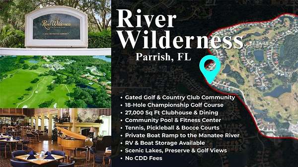 From I-75, take Exit 217 (SR-64 East) toward Parrish. Continue east on SR-64, then turn right onto Wilderness Blvd E. Enter the River Wilderness community and continue on Wilderness Blvd E. The property is located along Wilderness Blvd E within the community.