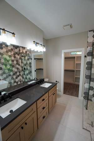 The primary suite includes a spa-inspired bath with dual vanities, bold hexagon tile accents, matte black fixtures, and a glass walk-in shower. Enjoy the elevated covered deck with ceiling fan and serene wooded views.