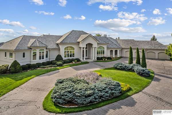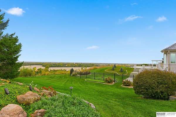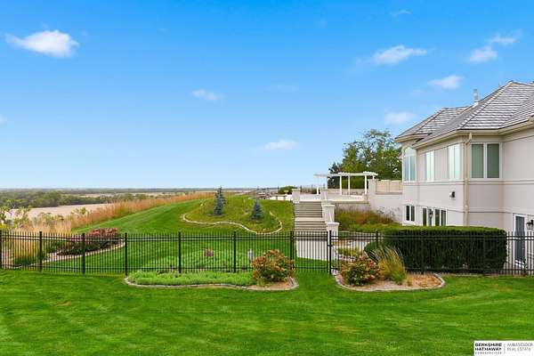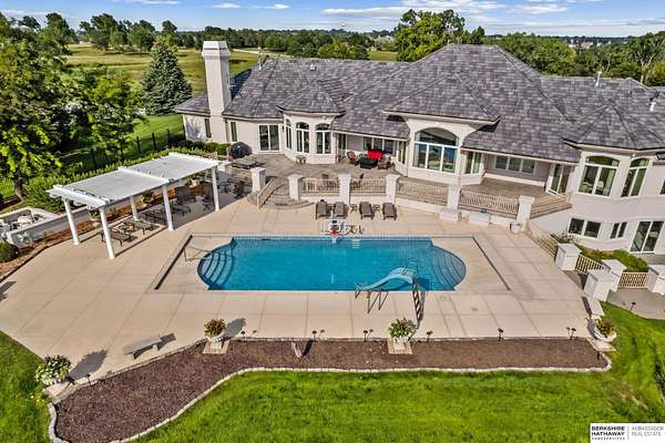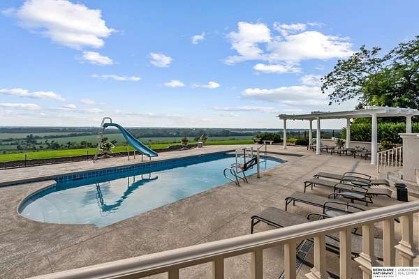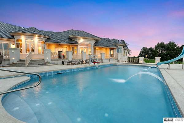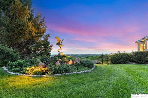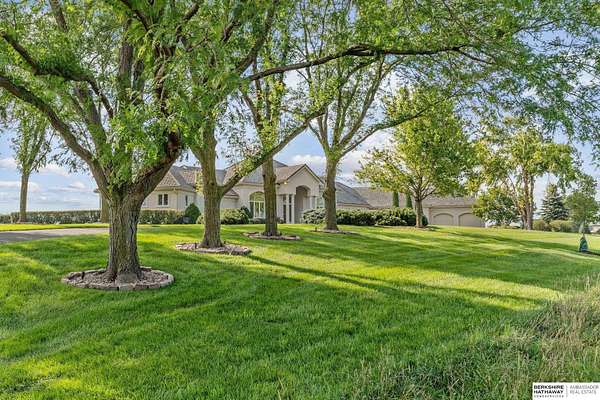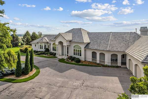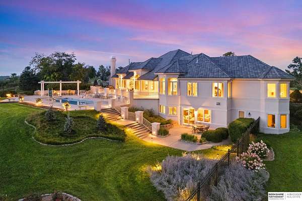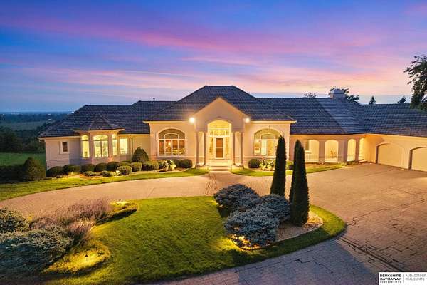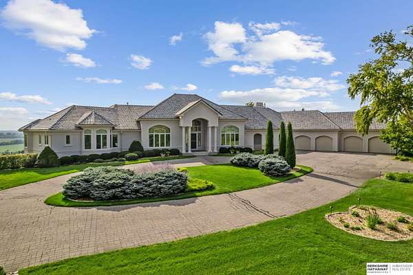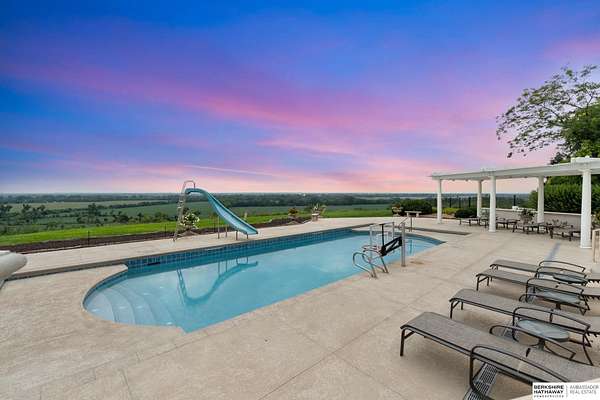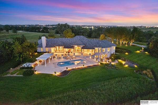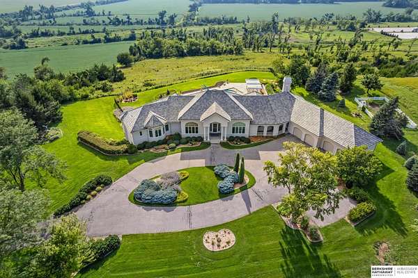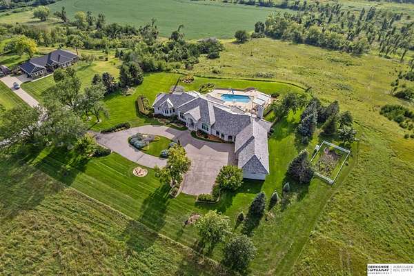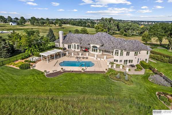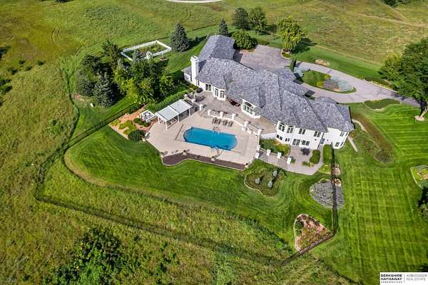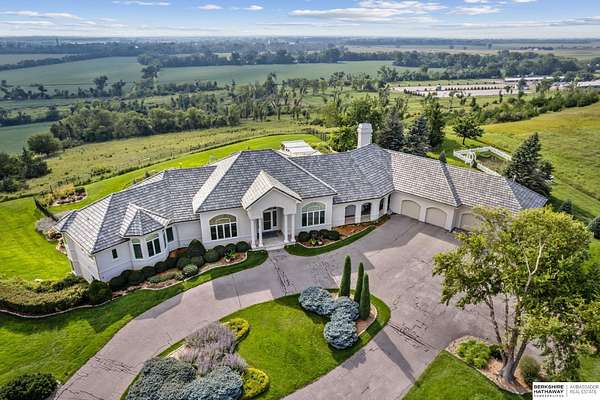 Deb Cizek, M: 402-699-5223, deb.cizek@bhhsamb.com, https://www.bhhsamb.com/deb.cizek - One-of-a-Kind Private 10+Acre Estate offers Expansive Views! Rarely available & rich in possibility, ranch home has sweeping, panoramic views stretching for miles. With this sprawling custom home, no detail was missed. Open living spaces were designed for everyday comfort & family entertaining. You'll love the bright, light-filled great rm w/ expansive windows & working in the wood paneled office or tiled sunroom. Kitchen w/ double islands, large walk-in pantry, & open to large hearth rm. Primary BR features sitting rm, exercise rm, laundry rm, & dreamy closet w/ built ins. W/O LL has 2 BRs, wet bar, & tons of storage. Major upgrades include new slate tile roof & Pella windows & sliding doors (see property highlights). Outside is a personal oasis: sparkling pool w/ automatic cover, slide, & fountains, cozy lounge areas, pergola, mature landscaping, lighting, & fenced garden area. With this once-in-a-