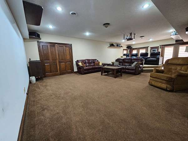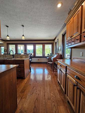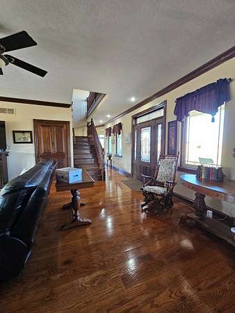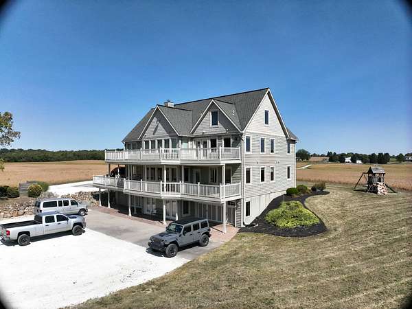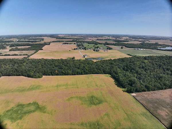 Est $21,314/mo211.76 acres with 158.66 acres tillable, 44.59 acres wooded, 4.57 acres pasture. Custom built 5 BR home, 4 BA, hardwood floors, all custom woodwork, kitchen w/custom cabinets, Whirlpool appliances, breakfast room/turret room, den/office, sitting room w/cathedral ceiling, 4 stop elevator, finished attic, finished basement w/movie room w/theatre seating, surround sound, wrap-around porch, patio, 4 car basement garage, 4-wheeler garage, 16x16 garage, professional stocked pond.