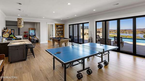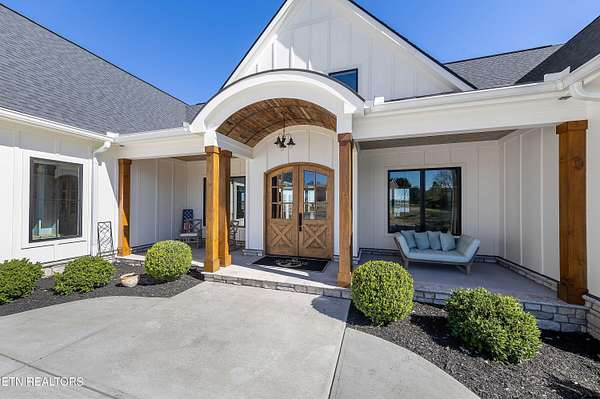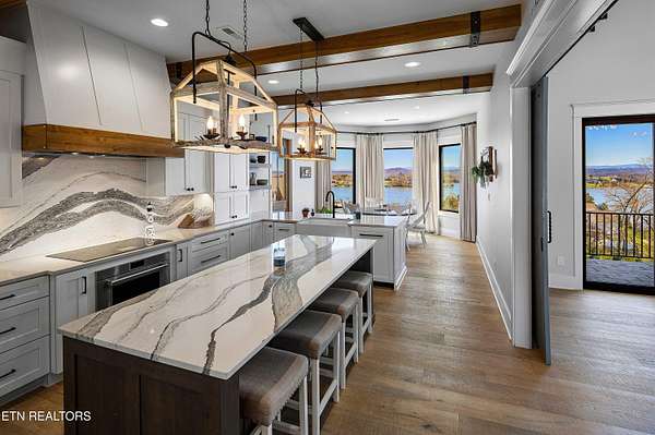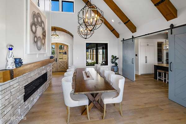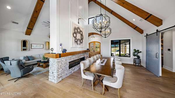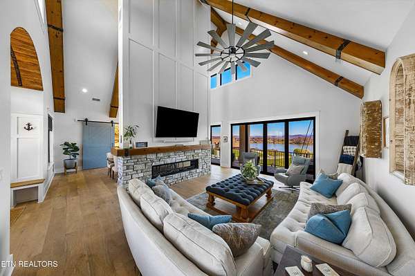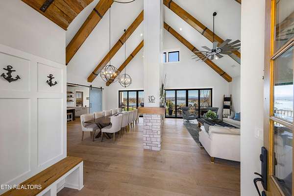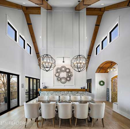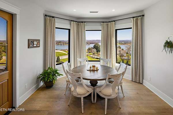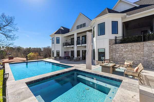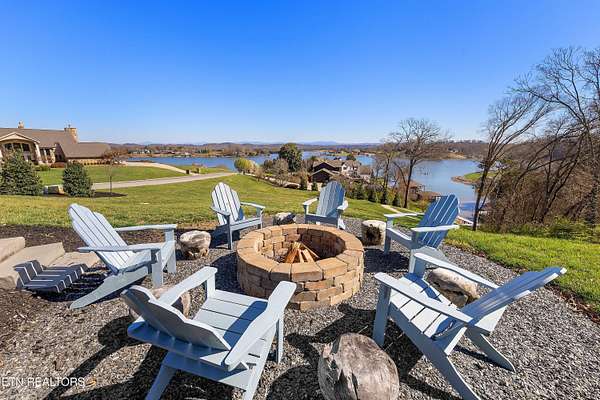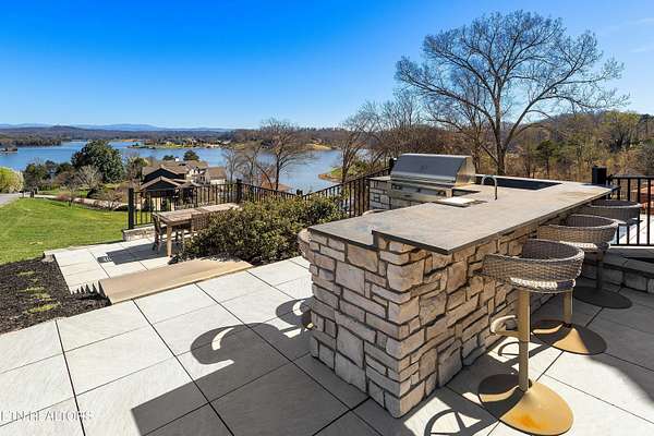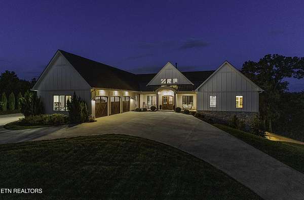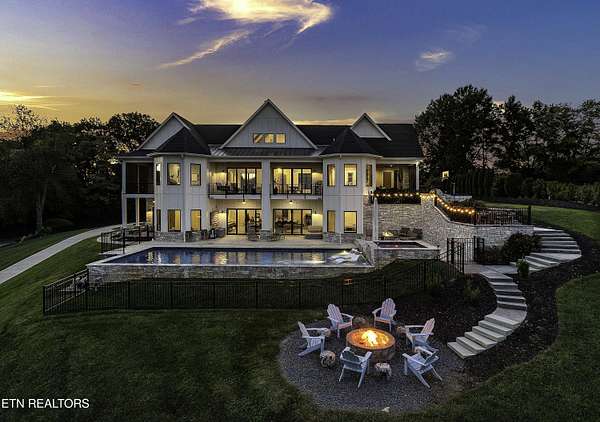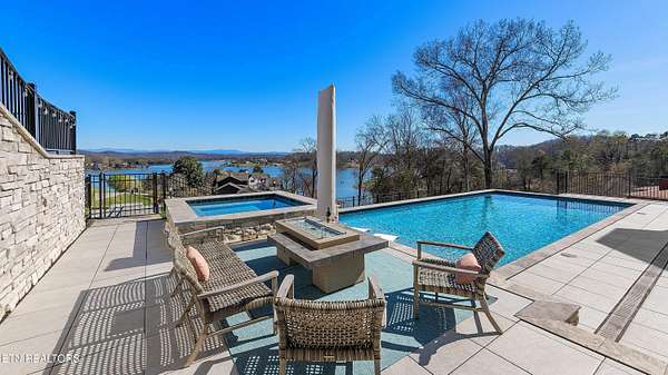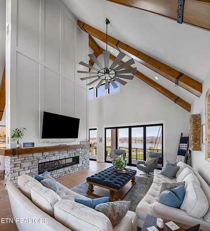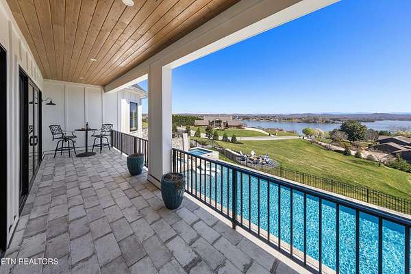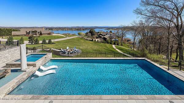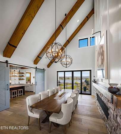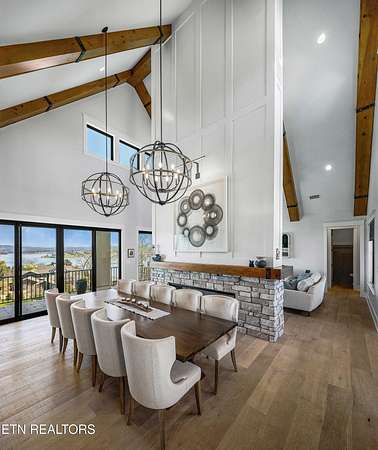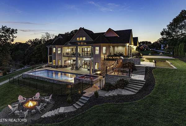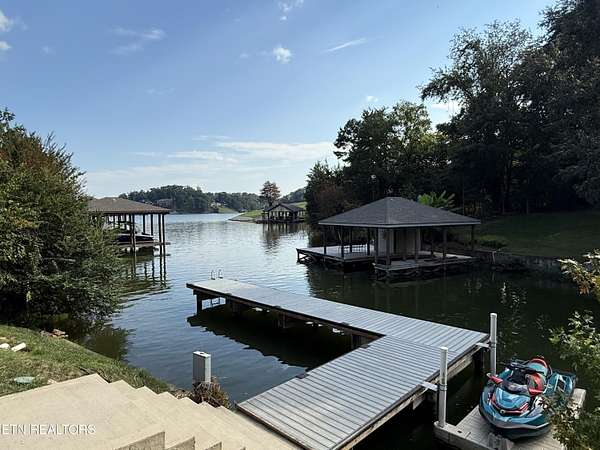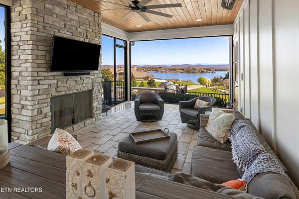 Imagine living the life on the water you have always wanted! This waterfront home in Lakeshore Meadows offers an incredible opportunity to wake up each morning with sweeping views of the water and mountains of East Tennessee. This home opens up like the perfect package through the foyer and its barrel shaped ceiling with tongue and groove. Soaring ceilings, exposed beams, hardwood floors and more are merely some of the beautiful touches within this primary living space plus a wall of glass creates the perfect framed view. A two-way fireplace and an extended wall create a boundary between the primary living space and the formal dining area and access to the upper balcony allows family and guests to spill outside to enjoy beautiful sunsets. The eat-in kitchen is spacious with a large island, butler's pantry, double ovens, stainless appliance and large island/breakfast bar offering all the tools and space you need for hosting parties of one or many. Off the kitchen is an enclosed porch with fireplace perfect for all seasons and an ideal location to enjoy time home while taking in the view. The primary suite is spacious enough for a small seating area and also has its own private screened in porch for quiet time at the beginning and end of your day. The attached bath offers a spacious walk-in shower, dual vanities, large walk-in closet and access to the laundry room. Another en-suite bedroom completes this upper level while the lower-level offers a large recreation room perfect for gaming tables and lots of seating plus the secondary kitchen helps create the ideal spot for hosting lake and pool days for all your family and friends. A secret bedroom behind a built-in bookcase will be a delightful surprise for anyone and the remaining two bedrooms with a Jack-n-Jill bath complete the interior. There are many options for outdoor entertaining with a beautiful pool, bocce ball court, hot tub, grilling station with bar, fire pit plus a dock for boating and swimming. An incredible opportunity to live the type of life you have always yearned for!
