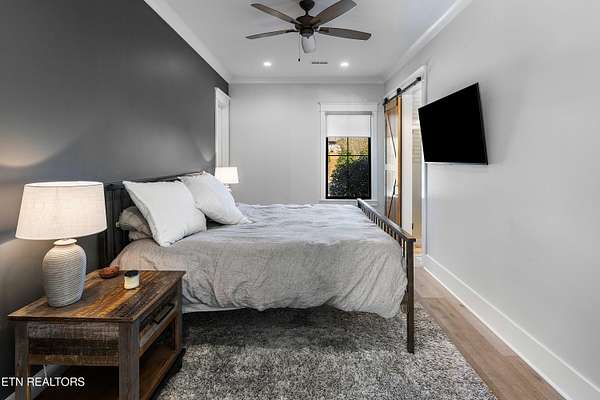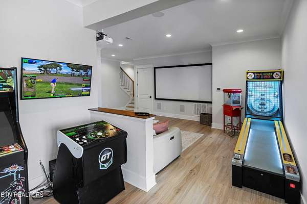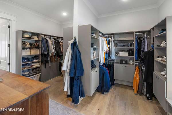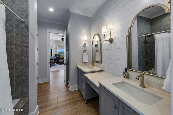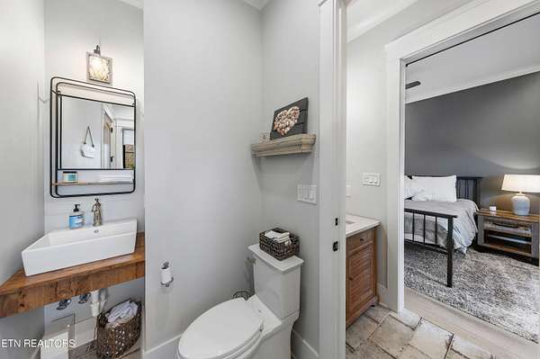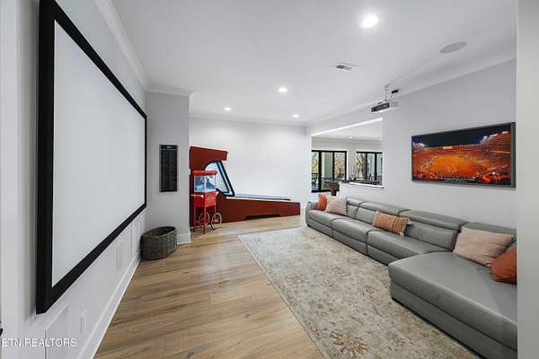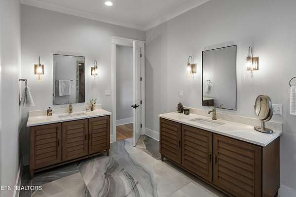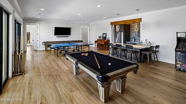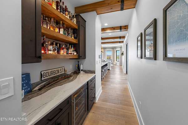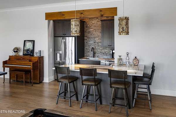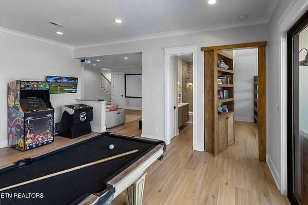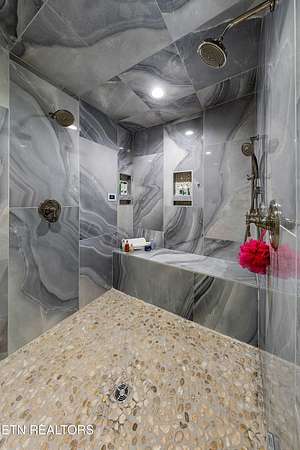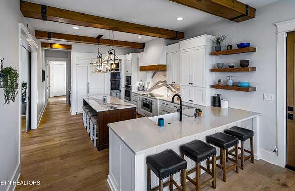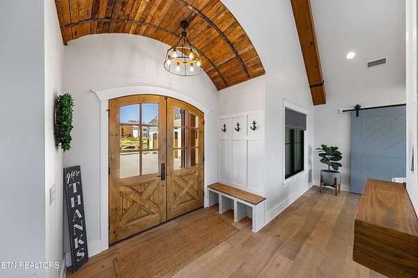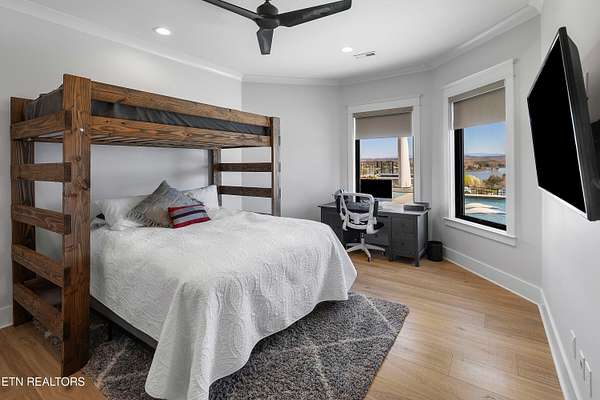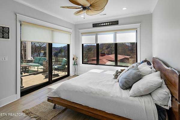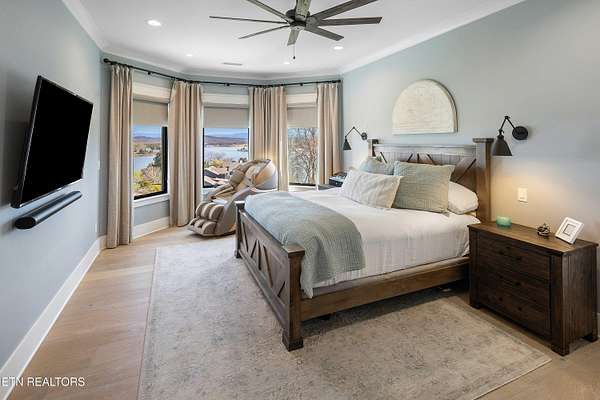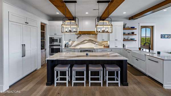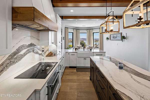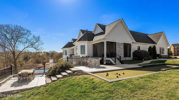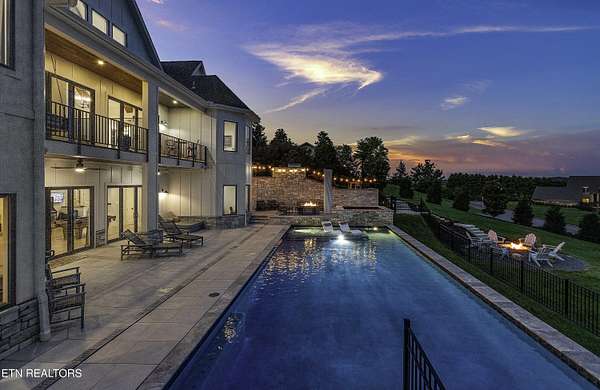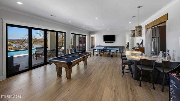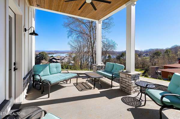 Imagine living the life on the water you have always wanted! This waterfront home in Lakeshore Meadows offers an incredible opportunity to wake up each morning with sweeping views of the water and mountains of East Tennessee. This home opens up like the perfect package through the foyer and its barrel shaped ceiling with tongue and groove. Soaring ceilings, exposed beams, hardwood floors and more are merely some of the beautiful touches within this primary living space plus a wall of glass creates the perfect framed view. A two-way fireplace and an extended wall create a boundary between the primary living space and the formal dining area and access to the upper balcony allows family and guests to spill outside to enjoy beautiful sunsets. The eat-in kitchen is spacious with a large island, butler's pantry, double ovens, stainless appliance and large island/breakfast bar offering all the tools and space you need for hosting parties of one or many. Off the kitchen is an enclosed porch with fireplace perfect for all seasons and an ideal location to enjoy time home while taking in the view. The primary suite is spacious enough for a small seating area and also has its own private screened in porch for quiet time at the beginning and end of your day. The attached bath offers a spacious walk-in shower, dual vanities, large walk-in closet and access to the laundry room. Another en-suite bedroom completes this upper level while the lower-level offers a large recreation room perfect for gaming tables and lots of seating plus the secondary kitchen helps create the ideal spot for hosting lake and pool days for all your family and friends. A secret bedroom behind a built-in bookcase will be a delightful surprise for anyone and the remaining two bedrooms with a Jack-n-Jill bath complete the interior. There are many options for outdoor entertaining with a beautiful pool, bocce ball court, hot tub, grilling station with bar, fire pit plus a dock for boating and swimming. An incredible opportunity to live the type of life you have always yearned for!