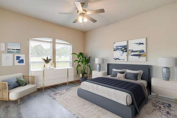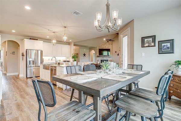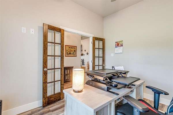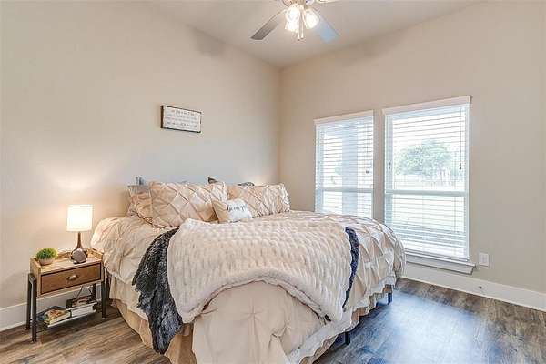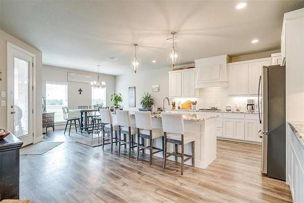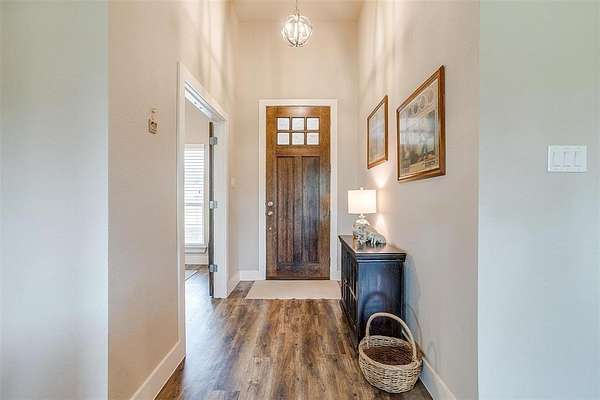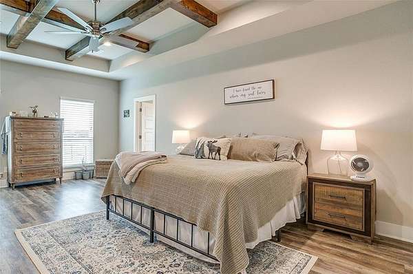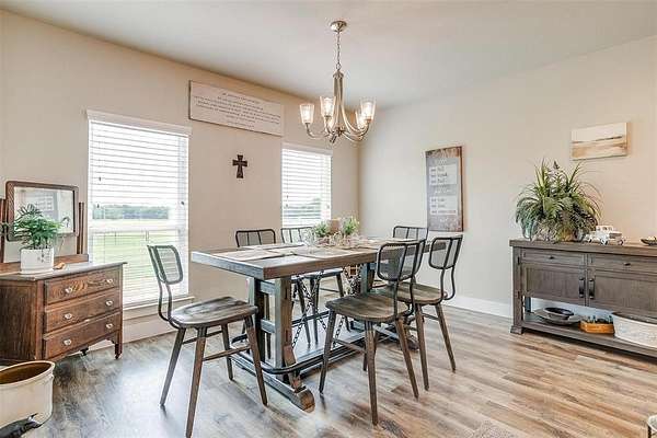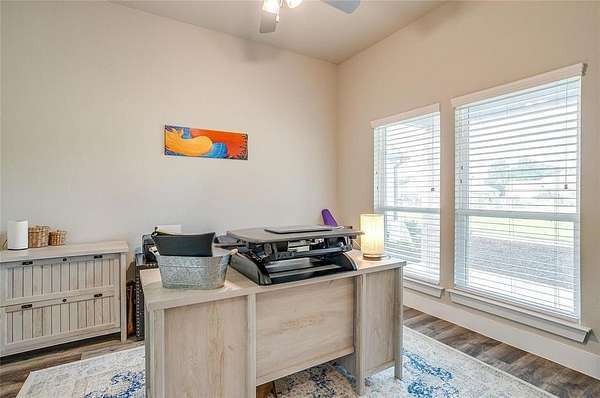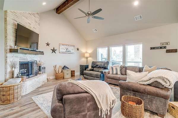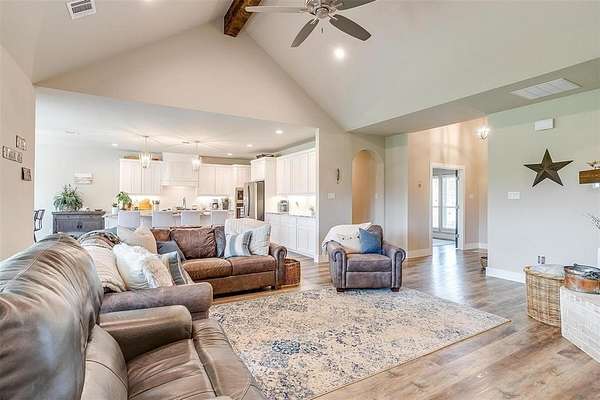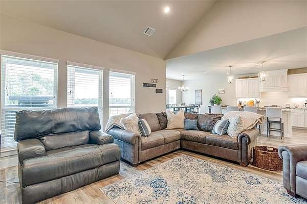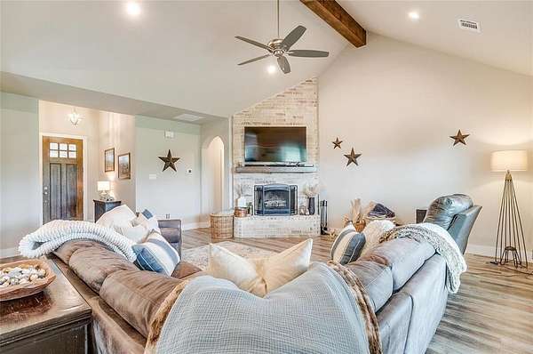 Welcome to your dream home, perfectly situated on a pristine 2-acre lot--ideal for soaking in the serenity of country living. At the front of the house there is a spacious flex room that's perfect as a home office, playroom, or extra living area. There is beautiful wood-look flooring throughout--no carpet anywhere--offering both style and low-maintenance living. The inviting living room boasts soaring vaulted ceilings with striking exposed beams and a stunning stone fireplace that creates the perfect cozy focal point. The open-concept kitchen is a host's dream, complete with a large center island, dedicated coffee bar, walk-in pantry, and generous cabinet space for all your storage needs. Tucked away for privacy, the primary suite offers a peaceful retreat. The spa-like ensuite bath includes dual vanities, a luxurious soaking tub, and a spacious walk-in closet. This home is loaded with thoughtful upgrades including a water softener and filtration system, in-ground propane tank, and custom blinds. Enjoy peaceful mornings and tranquil evenings on the covered back patio, where you can take in the quiet countryside. Don't miss your chance to experience the best of country living in this move-in ready home!