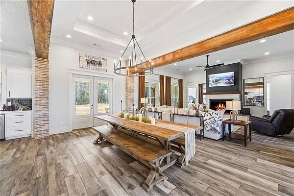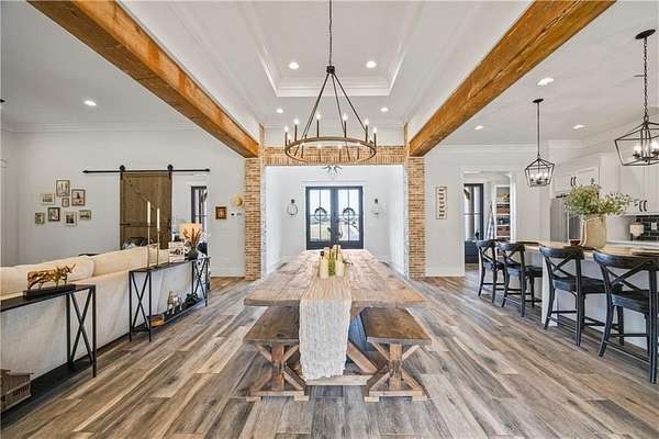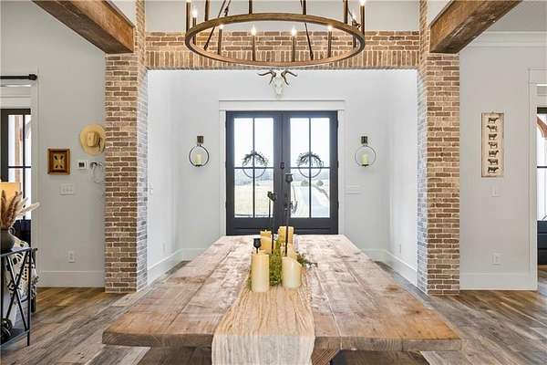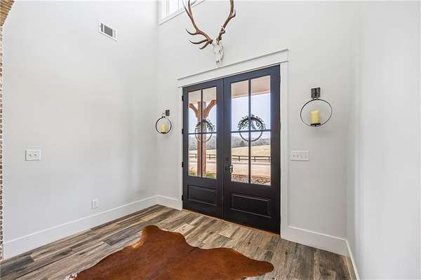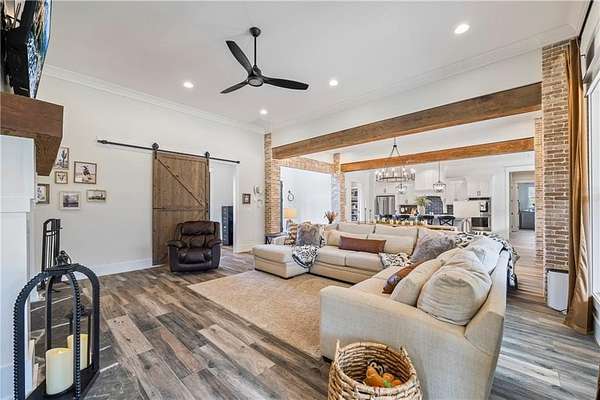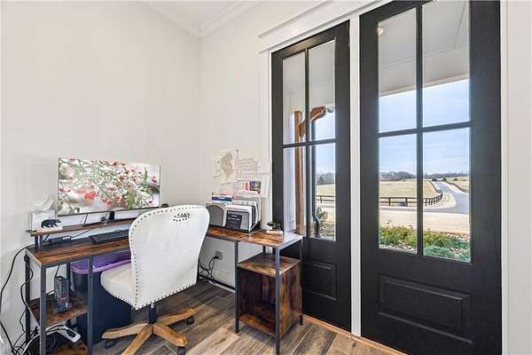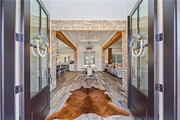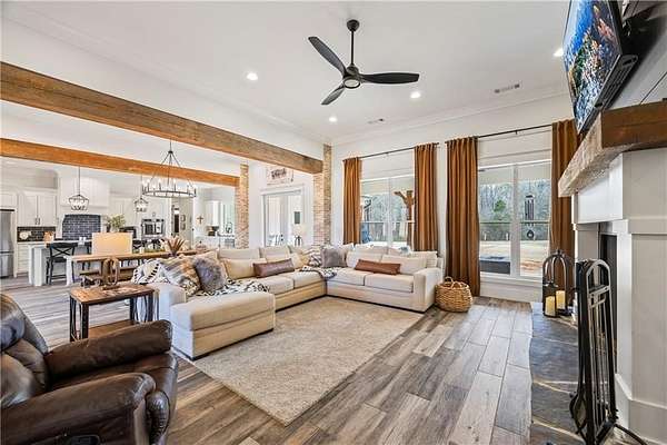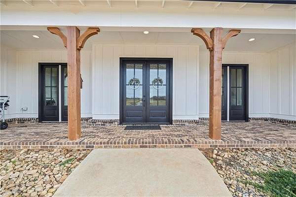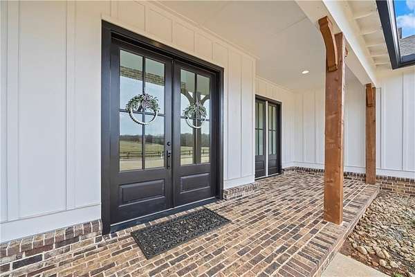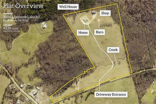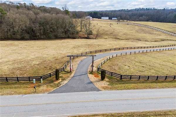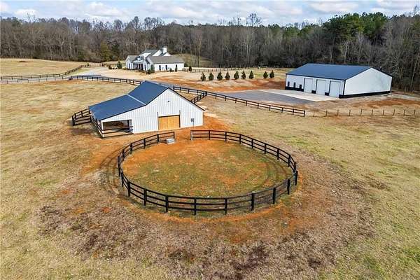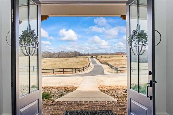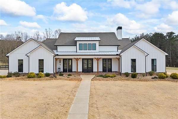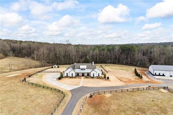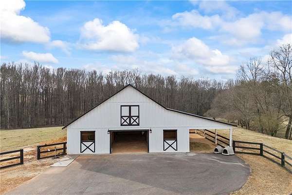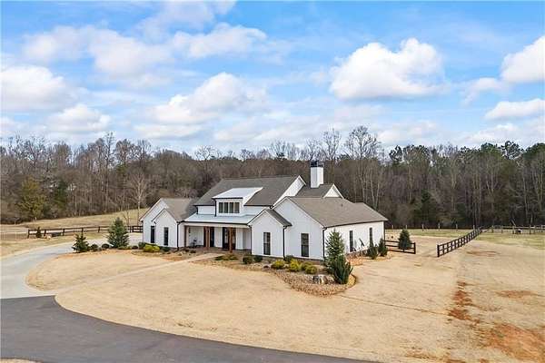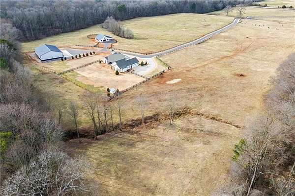 This luxurious farmhouse-style home, perfectly situated on 43+ acres in Jackson County, offers a peaceful and secluded retreat just minutes from your local stores. The private, paved driveway leads to a stunning home, shop, and barn, nestled among lush greenery and a pasture for livestock. The open-concept floor plan boasts four bedrooms, three full bathrooms, and a half bathroom, all situated on the main level. The kitchen seamlessly transitions to a bright, flat, fenced private backyard with an inviting covered porch area, perfect for entertaining. Upgrades throughout the home include quartz countertops, striking real wood beams, porcelain tile flooring, a 50 wood-burning fireplace, oversized pantry, extra tall doorways, large picture windows throughout, and custom cabinet shelving. A recently constructed 60 x 80 shop features three 14 ft garage doors/bays, including an RV hook-up. The 38 x 64 barn, built in 2024, comprises four stalls, a feeding room, power, water, and a hay shed. Exterior features include a 10-zone sprinkler system, multiple water stations, cross-fencing, and a 60-foot corral. This 43-acre farm offers endless opportunities for farming, horseback riding, cattle, outdoor adventure, and recreation. All of this perfectly nestled between 985 and I85 corridors for easy access.