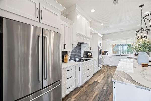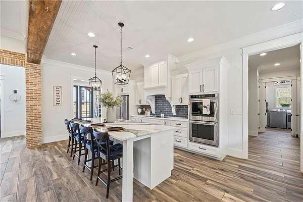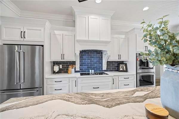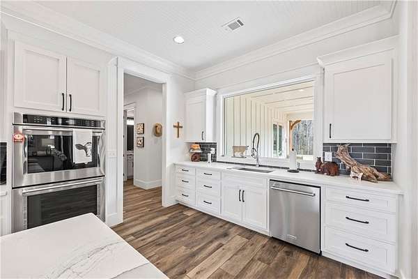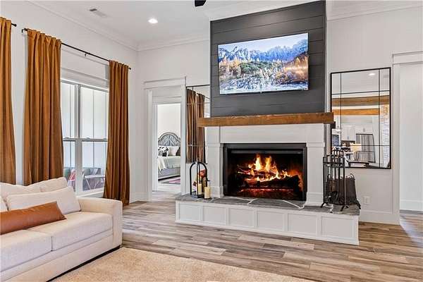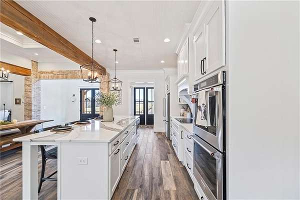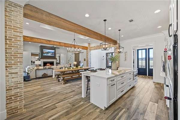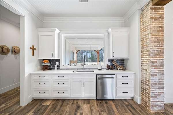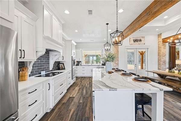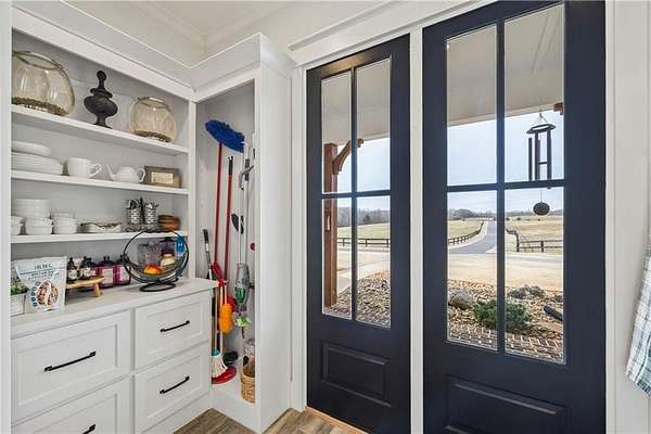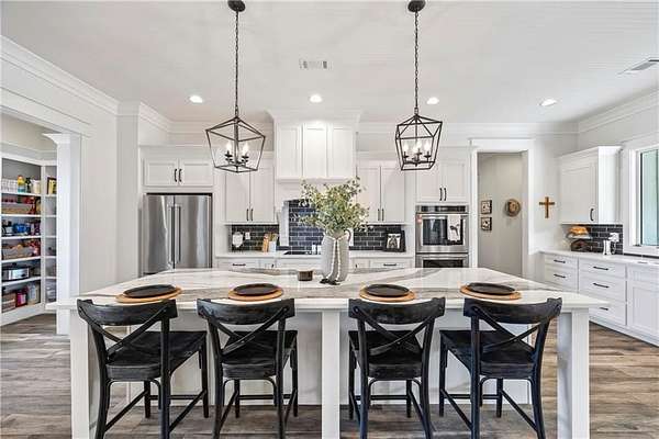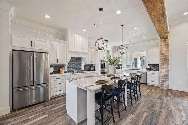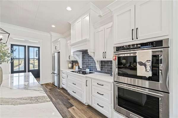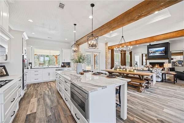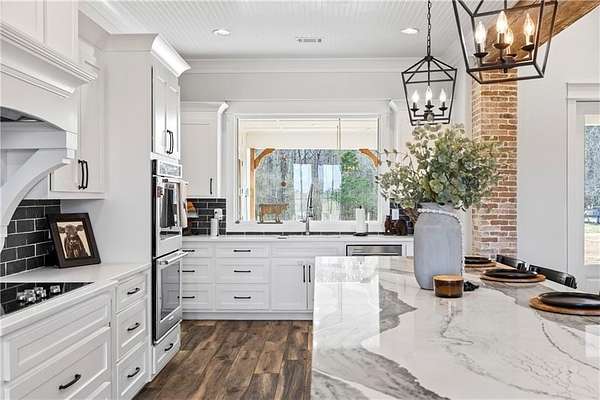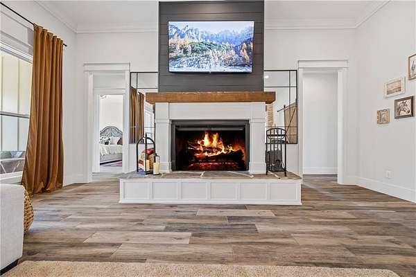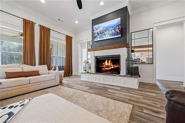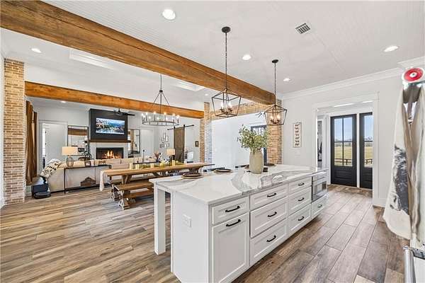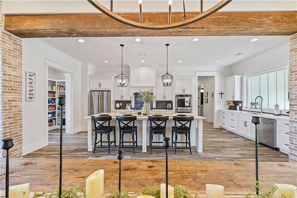 This luxurious farmhouse-style home, perfectly situated on 43+ acres in Jackson County, offers a peaceful and secluded retreat just minutes from your local stores. The private, paved driveway leads to a stunning home, shop, and barn, nestled among lush greenery and a pasture for livestock. The open-concept floor plan boasts four bedrooms, three full bathrooms, and a half bathroom, all situated on the main level. The kitchen seamlessly transitions to a bright, flat, fenced private backyard with an inviting covered porch area, perfect for entertaining. Upgrades throughout the home include quartz countertops, striking real wood beams, porcelain tile flooring, a 50 wood-burning fireplace, oversized pantry, extra tall doorways, large picture windows throughout, and custom cabinet shelving. A recently constructed 60 x 80 shop features three 14 ft garage doors/bays, including an RV hook-up. The 38 x 64 barn, built in 2024, comprises four stalls, a feeding room, power, water, and a hay shed. Exterior features include a 10-zone sprinkler system, multiple water stations, cross-fencing, and a 60-foot corral. This 43-acre farm offers endless opportunities for farming, horseback riding, cattle, outdoor adventure, and recreation. All of this perfectly nestled between 985 and I85 corridors for easy access.