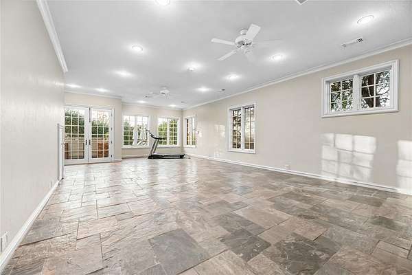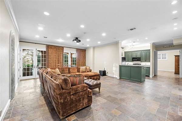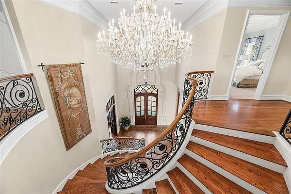 This masterpiece was conceived as a French château, shaped by European architectural influence and designed for lasting comfort. Many of the home’s architectural elements were sourced from Europe and installed first, with the structure designed around them, giving the residence a collected, timeless presence. More photos and list of features at www.3004shadowdrive.com. Set on two wooded acres along the West Fork of the Trinity River, the property offers rare privacy while remaining equidistant to Downtown Dallas and Fort Worth. Winding trails lead to the water’s edge, while the rear of the home overlooks Lake Viridian. The residence spans 9,026 square feet across three levels, with an additional 835 square feet of flexible upper-level space, all served by an elevator. The main living areas are climate controlled by a geothermal system, with traditional HVAC serving the garage and flex space. The main level features a grand entry with Versailles-inspired flooring, sweeping iron staircase, and crystal chandelier. A central parlor opens through imported French château doors to the veranda and is anchored by a Louis XIV limestone fireplace. The formal dining room, wet bar, office with Regency-era fireplace and London post-office doors, chef’s kitchen with a separate catering kitchen, and a private primary suite with dual baths and custom closets complete the main floor. The pool level includes a full kitchen, wine cellar, game or studio space, laundry, and direct access to the resort-style terrace rebuilt by Claffey Pools. The upper level offers three bedrooms, two baths, catwalk views, and a balcony suite overlooking the estate. A rare blend of European architecture, privacy, and location in the heart of North Texas.