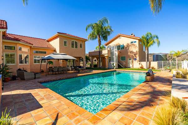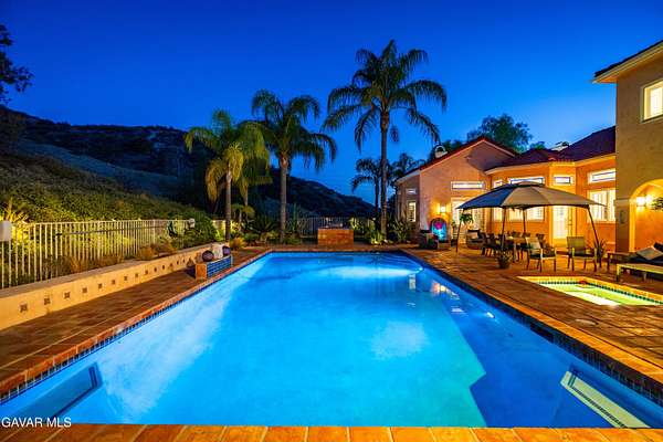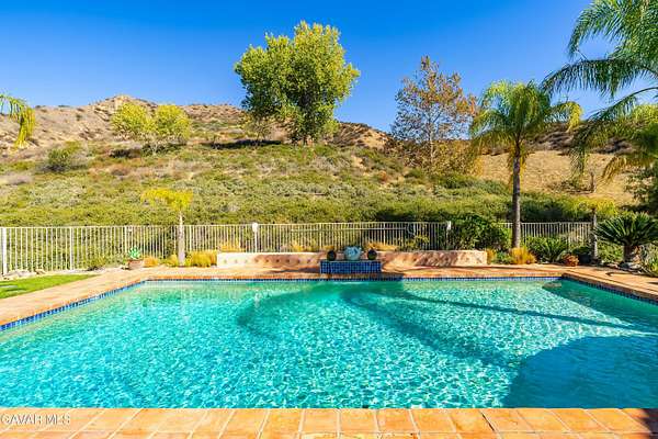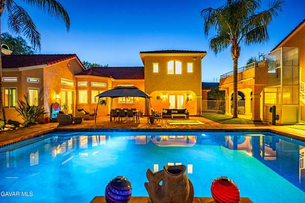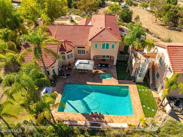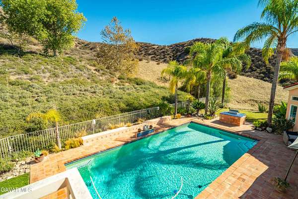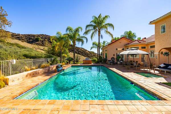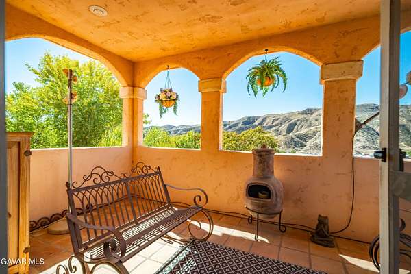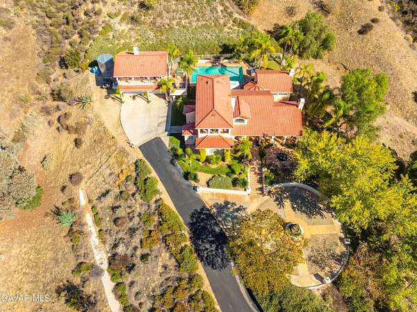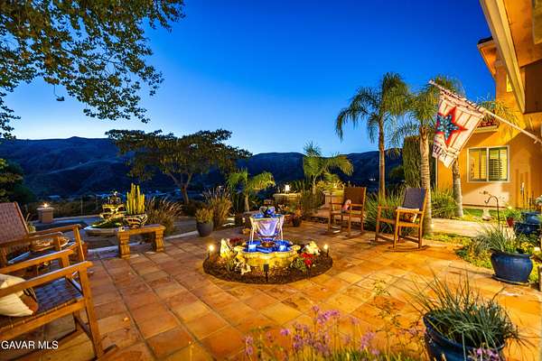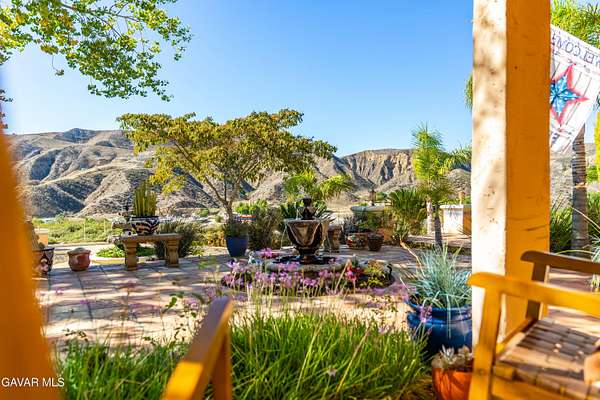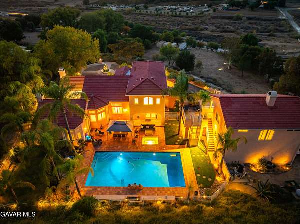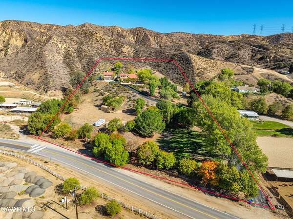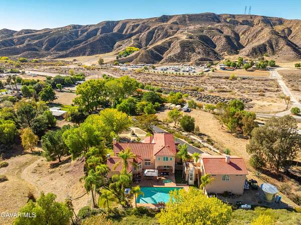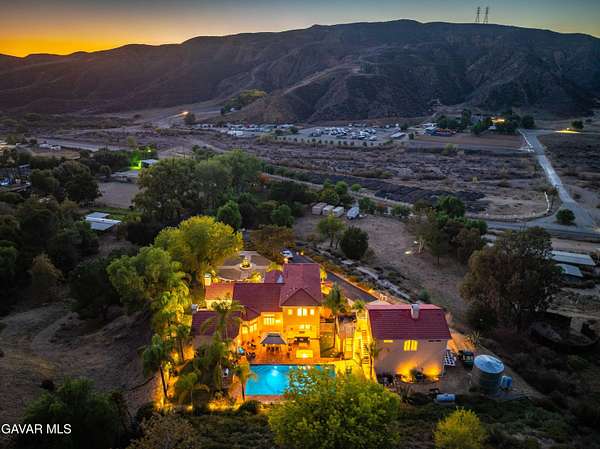 Discover unmatched tranquility and sweeping mountain vistas from this custom Mediterranean estate, perfectly set on six plush acres in historic San Francisquito Canyon. Built in 1994, this 3,151 sq. ft. villa offers 3 bedrooms, 2.5 baths, and a versatile room (office/den/study). A grand double-door entry welcomes you past lighted fountains into a foyer with vaulted ceilings and authentic Saltillo tile floors throughout the main level. The living and dining rooms center around a Spanish-tiled wood burning fireplace, framed by windows and French doors that open to the front patio and breathtaking views. The chef's kitchen features cobalt blue Italian tile, a butcher block island, and a walk-in pantry, while the adjoining family room offers a wood stove and views of the pool. The main level also includes two bedrooms, 1.5 baths, an office/den/study, and a laundry area. Upstairs, the primary suite is a private retreat with vaulted ceilings, panoramic views, a private deck, and a spa-inspired bath with Jacuzzi tub, large shower, and dual vanities. Step outside to an entertainer's paradise featuring a 20' x 40' heated pool and spa, built-in BBQ, and expansive patios perfect for relaxing or entertaining. The lower acreage offers open meadows ideal for horses, barns, storage, or stables. Above the oversized 3-car garage -with 9'+ ceilings, 220V power, sink, and automatic openers - is a fully permitted 650+ sq. ft. guest house featuring vaulted ceilings, a kitchen, wood stove, large bedroom, 3/4 bath, and private deck with panoramic views. An elevator provides wheelchair access, perfect for guests or extended family. Enjoy ultimate privacy where deer graze at dusk and peace surrounds you. A true blend of Mediterranean charm and Santa Clarita serenity - this one-of-a-kind estate must be seen to be believed.
