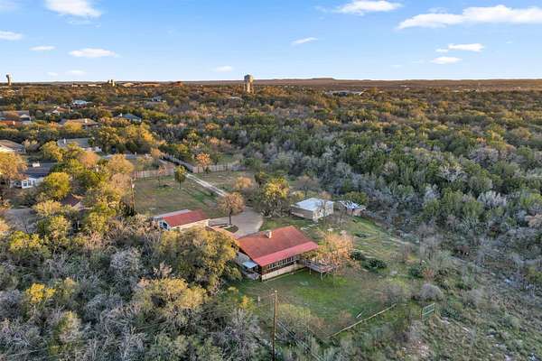 Tucked behind a private gated drive, this exceptionally remodeled Spanish-style estate rests on 4 fully fenced acres with a sprinkler system and sweeping Hill Country views. Thoughtful upgrades shine throughout, including fresh paint with vibrant pops of color that brighten the interiors, decorative light fixtures, new HVAC and beautifully tiled showers that elevate everyday living. The main residence offers 3 bedrooms and 2.5 bathrooms, featuring walk-in closets, rich wood accents, and a fireplace that anchors the living space with warmth. An enclosed front patio, sun-drenched sunroom, and expansive back deck overlooking the Hill Country create seamless indoor-outdoor living ideal for both entertaining and quiet retreat. The kitchen is designed with both beauty and function in mind, showcasing butcher block countertops, a double oven, electric cooktop, dishwasher, and fridge. The kitchen area flows into the dining area, so no matter where you are, cooking, or hanging out at the dining room table you are a part of all the conversations and action. A separate guest building provides exceptional versatility, complete with an additional bedroom, bathroom, laundry room, and garage-ideal for guests, extended family, or private studio space. The property is equally equipped for refined country living, offering a livestock shelter and lean-to for animals and rainwater collection tanks. Make this 4 acres your private Hill Country Homestead & still be within minutes of the action of the City.