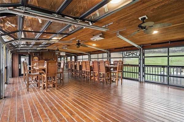 Covered porch dining area featuring roll up glass garage doors creating an open air dining atmosphere.