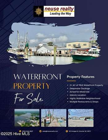Consider two acres of unduplicatable prime waterfront MU-1 property with attached deepwater dockage, nestled in the quaint seaside village of Oriental NC, referred to as the sailing capital of the US East Coast. Redevelopment end uses currently contemplated are summarized in the uploaded documents include: 20 seaside condominium units OR an international ECO Hub to showcase emerging products and services in the sustainability space. Nearby regional airports, colleges and universities, waterfront which flows to the nearby ICW all support end uses limited only by the vision of the buyer. Appraisal, surveys, Phase 1 available for review.