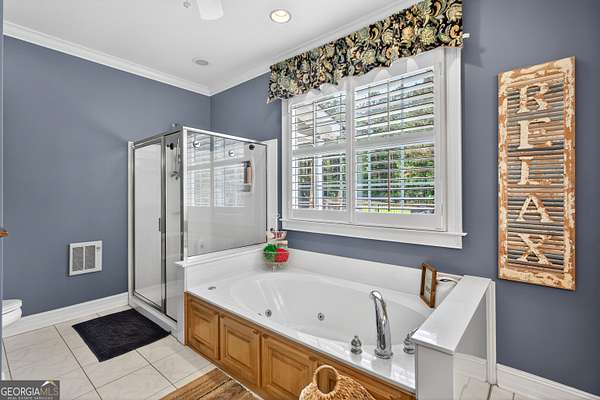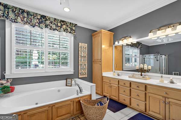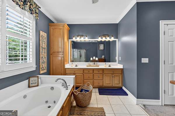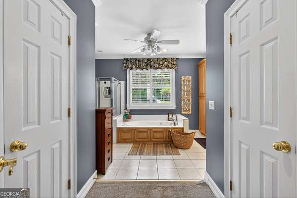 - Bookcases, Double Vanity, High Ceilings, Master On Main Level, Separate Shower, Soaking Tub, Tile Bath, Walk-In Closet(s)