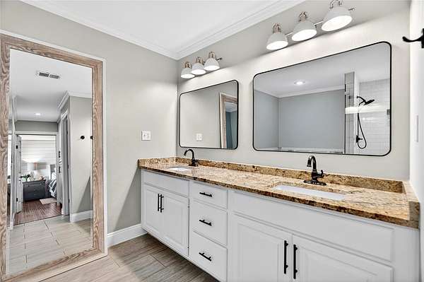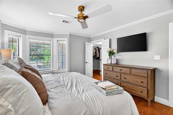 - Breakfast Bar, Ceiling Fan(s), Ceiling-High, Crown Molding, Double Vanity, Eat-In Kitchen, Entrance Foyer, Granite Counters, Interior Steps, Kitchen Island, Multiple Dining Areas, Multiple Living Areas, Quartz Counters, Soaking Tub, Walk-In Closet(s)