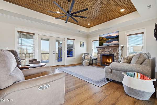 Thoughtfully designed and custom built by Jason Day Construction, this residence offers a rare combination of refined interior finishes, expansive land, and long-term flexibility, set on 19.99 +/- acres with no HOA. From the moment you arrive, the home feels intentional. Inside, the main living area is warm and composed, anchored by a statement fireplace and filled with natural light. Wide-plank flooring flows throughout, creating a seamless connection between spaces designed for both everyday living and effortless gathering. The kitchen blends function and atmosphere, featuring granite countertops, under-cabinet lighting that adds a soft evening glow, electric appliances, and a generous island that invites conversation. It's a space that works just as well for quiet mornings as it does for hosting. The primary suite offers a calm retreat, framed by peaceful views of the surrounding land. The ensuite bath is spa-inspired, complete with a freestanding soaking tub, tiled walk-in shower, dual vanities, and a walk-in closet, designed for comfort without excess. The lower level expands the home's livability with a fully finished living area, ideal for a gym, media room, or secondary gathering space. Two additional bedrooms and a full bathroom provide privacy and flexibility for guests or family, while an unfinished utility room adds valuable space for storage, systems, or future customization. The home is wired for a generator, offering long-term peace of mind. An oversized, finished two-car garage adds both practicality and storage. Outdoor living is where this property truly shines. A covered back deck with wood ceiling and recessed lighting overlooks rolling acreage, perfect for morning coffee or sunset evenings. Below, a covered concrete patio extends the living space outdoors, offering a quiet place to unwind and take in the setting. This is more than a home, it's space to breathe, room to grow, and the freedom to live on your own terms. Buyer/buyers agent to verify all info.