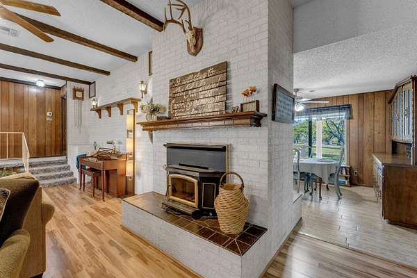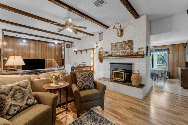 301 Wood Forest Rd in Kingsland, TX offers the perfect blend of Hill Country charm and functional acreage living. Situated on 5 fully fenced and cross-fenced acres, this 3-bedroom, 3-bath home is ideal for those seeking space, privacy, and versatility. Inside, you'll find a warm and inviting layout featuring a wood-burning fireplace and a unique wood stove oven that opens to both the dining and living areas-perfect for cozy gatherings. The kitchen is well-appointed with granite countertops, real all-wood cabinetry, and new appliances. Numerous bay windows throughout the home bring in natural light and highlight the surrounding landscape, while the vintage-style bathrooms add character and charm. Outdoor living is just as impressive with both front and back covered porches, ideal for enjoying peaceful country views. The property is equipped for a small ranch or homestead setup, featuring a horse barn with 3 stalls, a chicken coop, and a shed/shop for additional storage or workspace. A chain-link fenced yard surrounds the home, along with a gated entrance for added security. Additional features include a 2-car garage and a large RV-sized carport, providing ample room for vehicles, equipment, and recreational storage. With endless potential and located in the heart of Kingsland, this property is a rare opportunity to create your ideal Hill Country lifestyle.