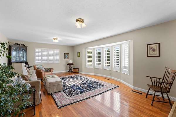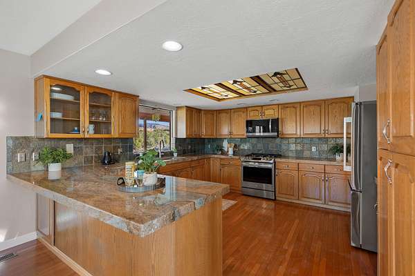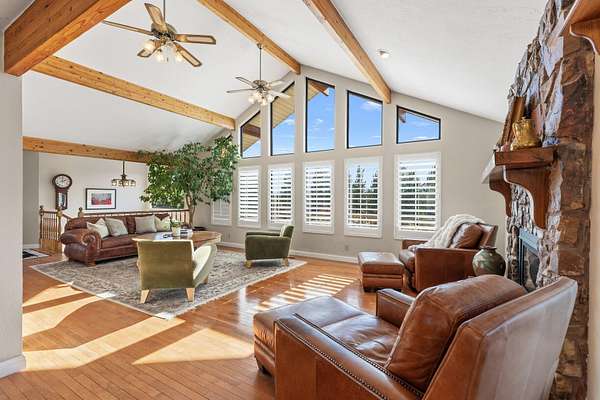 Discover serenity and sophistication in this beautifully crafted 2,936 sq ft home thoughtfully arranged across two levels of living and nestled on 1.50 acres of lush, landscaped grounds with mature trees, native gardens, and soothing stream frontage. Designed for comfort, creativity, and connection to nature, this residence blends elegant finishes with inviting warmth at every turn. Inside, you'll find 3 spacious bedrooms, 2.5 baths, and a thoughtfully designed layout offering three distinct living and family rooms, a formal kitchen with granite countertops, tile accents, and updated appliances. Gorgeous hardwood floors, two gas fireplaces, and abundant natural light add to the home's timeless charm. The heated, detached shop at 397 sq ft offers potential for a future guest suite or studio conversion, while the oversized 2+ car garage/workshop provides ample space for hobbies, vehicles, or storage. Outdoors, over 2,000 sq ft of covered decking extends your living space, perfect for year-round entertaining or peaceful evenings by the outdoor stone wood-burning fireplace. Every window frames valley and mountain views, creating an unmatched sense of tranquility and privacy. Whether you're an artist, gardener, or nature lover, this property embodies the ideal balance of refined comfort and natural beautya rare retreat where every detail reflects pride of ownership.