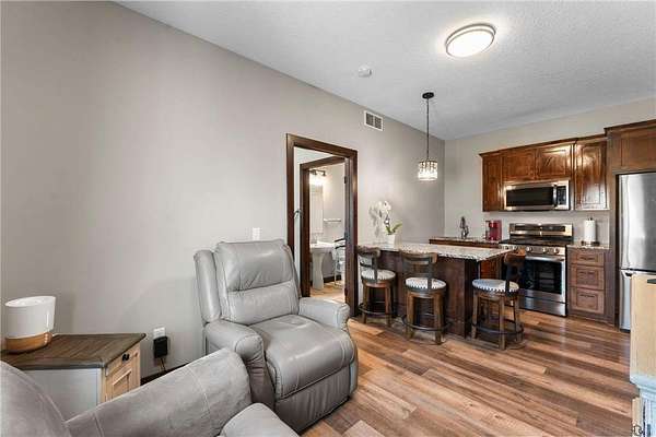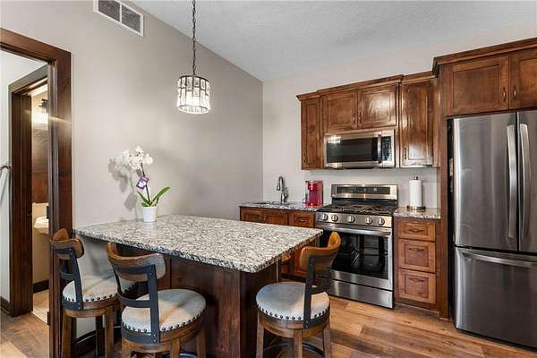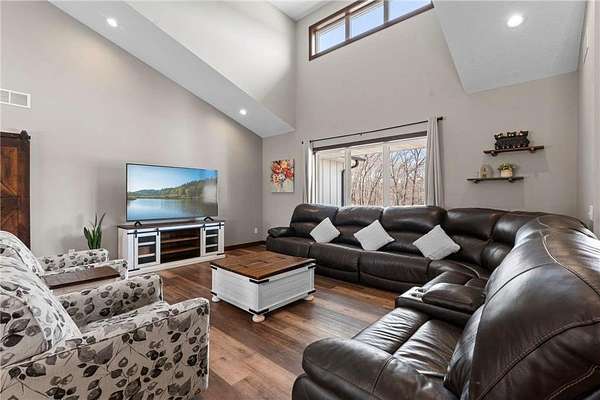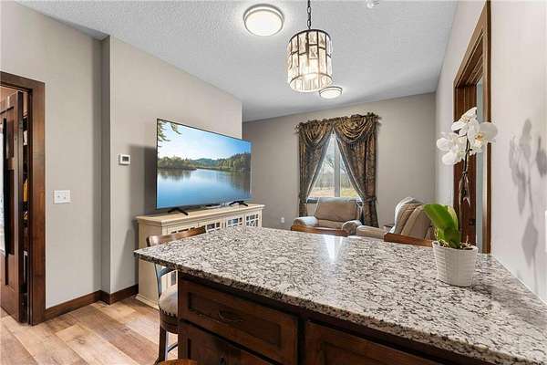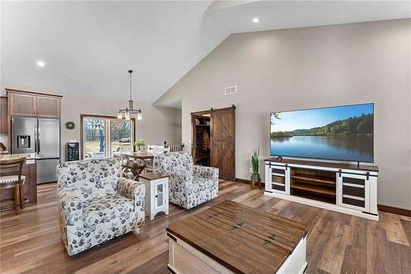 Inside, the main living area immediately stands out with 17-foot vaulted ceilings across the kitchen, dining, and living room, creating a wide-open feel that carries throughout the home with 9-foot ceilings in the remaining spaces. Knotty alder cabinetry, quality finishes, and an oversized center island anchor the kitchen and make it ideal for both everyday living and entertaining.