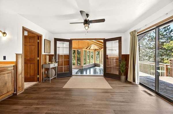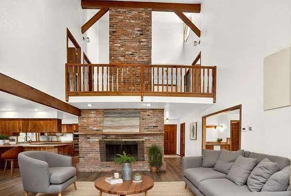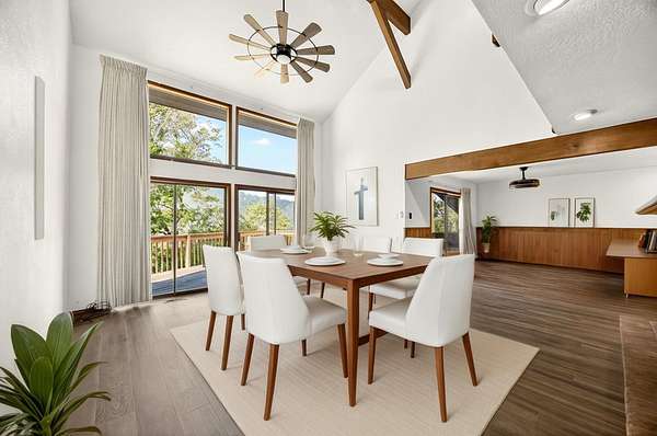 1st time on the market! Custom home built by Baldwin homes w/soaring ceilings, lg windows, many sliders to outdoor patios & decks, wood burning fireplace, 2 car portico. Many new updates includes new roof, beautiful new wide plank laminate flooring, new carpet, new wall oven, 2nd convectional wall/microwave oven, new refrigerator, dishwasher & wine refrigerator, granite counters w/eating bar, new exterior paint on cedar siding, new interior paint, newer heat pump w/back up wood forced furnace very efficient! Tile floors in all 3 bathrooms. Lower level Primary suite w/sitting area, lg shower, wood-burning fireplace & slider to a large patio. Main level living rm, kitchen, formal dining rm/office w/wet bar, great sunroom w/tile floors & many windows to take in the views. 3 bdrms upstairs 2 w/vaulted ceilings w/loft & balcony. Separate lg insulated shop room & separate insulated studio + an oversized 2 car garage, 3 carports & woodshed. Home sits on top of the mountain w/beautiful views.