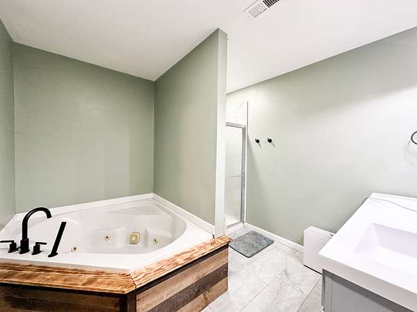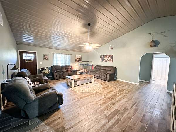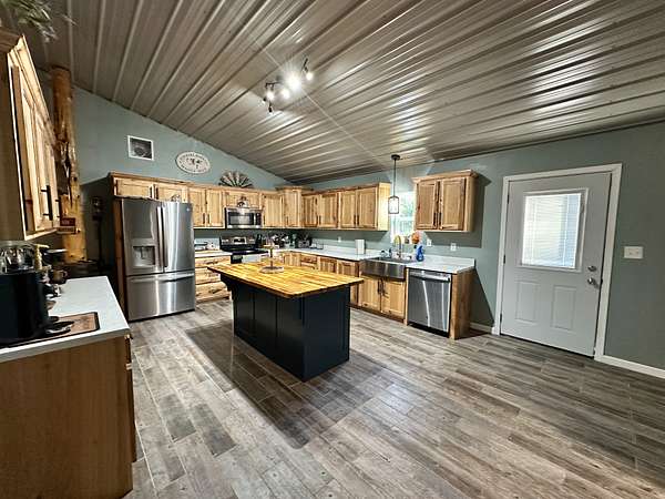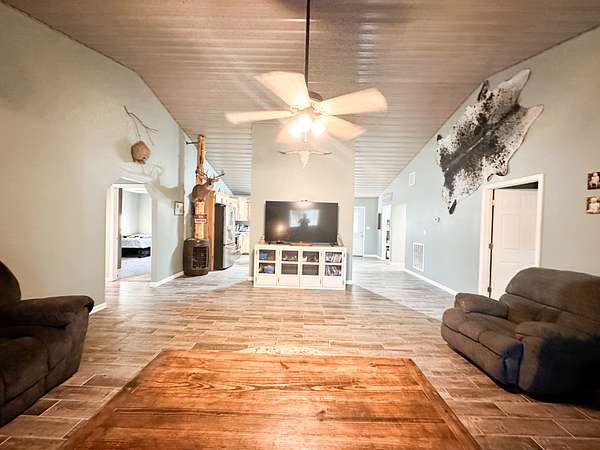 Experience the perfect blend of outdoor adventure and modern comfort on this 9.75-acre mostly wooded retreat, where wildlife abounds and the thrill of the hunt is just steps from your door. Game cam photos tell the story of trophy-worthy deer right on your land. Built in 2022, the 2,000 sq. ft. home offers 3 bedrooms, 2 baths, and a spacious great room with a cathedral ceiling and tile floors. The kitchen is a showpiece with custom-built hickory cabinets featuring soft-close drawers, double lazy Susans, a farmhouse sink, stainless appliances, a walk-in pantry, and a large island for entertaining. The primary suite includes a luxurious bath with a jetted tub, separate shower, double vanity, and tile flooring, while two additional bedrooms and a full bath ensure comfort for family and guests. Additional conveniences include a large laundry/mud room, electric heat pump, central air, and an outdoor wood furnace that also heats the garage.