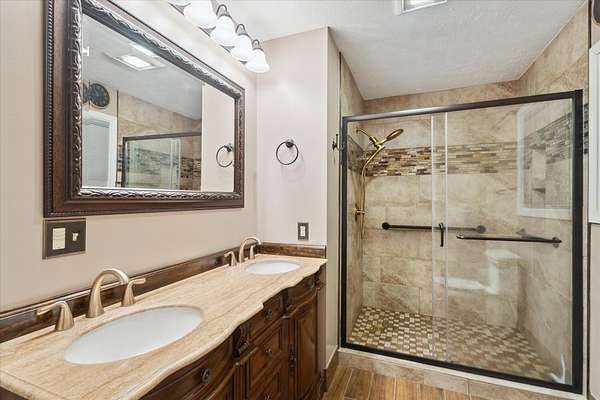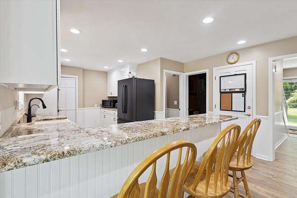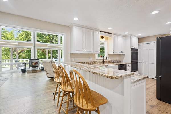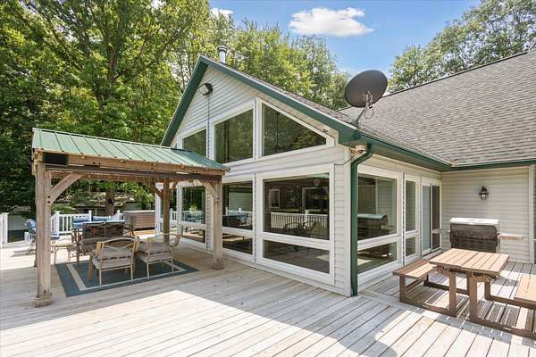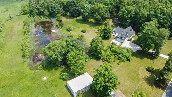 Subject to land division! Escape to your own private retreat on+/- 10 peaceful acres filled with wildlife, fruit trees, and serene views. This beautifully updated 3-bedroom (could easily be 5-bedrooms), 3-bath home features an incredible great room with walls of windows overlooking the property, perfect for taking in the quiet beauty of the land. Enjoy a newer kitchen with granite tops and white cabinets, tile baths, solid wood doors, geothermal heating, newer flooring, newer windows, roof, and deck. Outbuildings include a 30x60 shop and 25x35 barn. Pond with pier, pavilion, and more. A true country haven! Currently no homestead filed on the property. A homestead exemption yields a large property tax deduction.