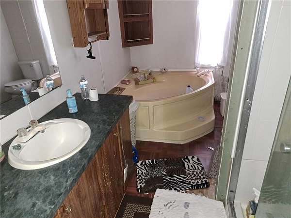 The interior features a living room with a fireplace, a separate dining room, and a functional laundry room. A front deck overlooks the acreage, offering a peaceful spot to relax and enjoy the surroundings. The master bedroom includes a garden tub and separate shower, creating the potential for a comfortable private retreat.