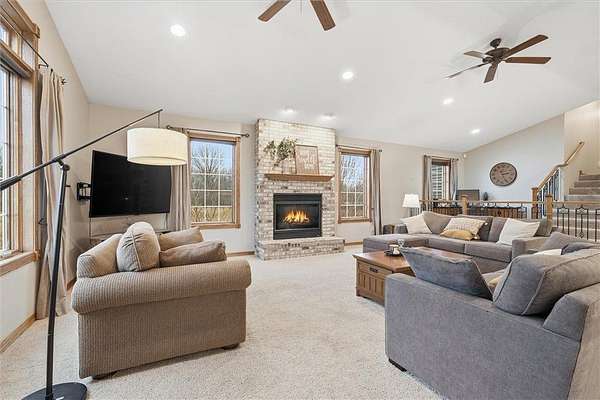 Welcome to this beautifully designed home featuring an outstanding and functional layout. The main level offers a welcoming entry, abundant natural lighting, hickory kitchen cabinets, new granite countertops, stainless steel appliances, under-cabinet lighting, hardwood floors, Pella wood windows, vaulted ceilings, and a gas fireplace. The spacious kitchen includes a breakfast bar overlooking the living room, and the large dining area accommodates gatherings with ease. A main-floor bath and a convenient laundry/mudroom are located just off the generous 4-car garage.