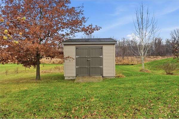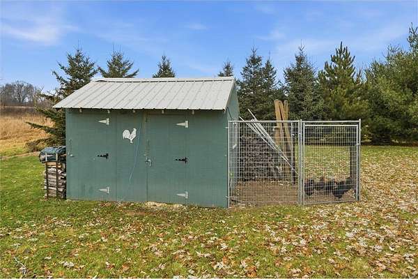 The 9+ acre property includes a garden, apple trees, a fire pit, chicken coop with optional laying hens, and ample space to enjoy.