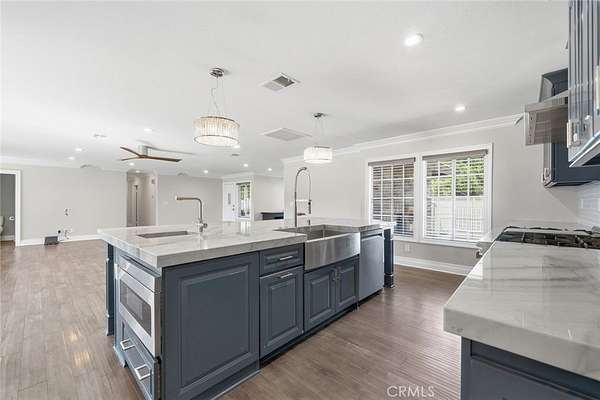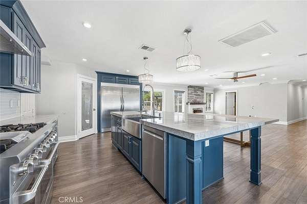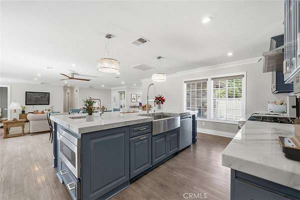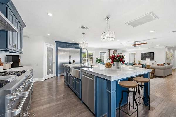 Inside, the home is refined and inviting. The chef's kitchen showcases a 6-burner Thor gas cooktop, double ovens, stainless steel appliances, a Gallery/Sub-Zero refrigerator, and a large granite island with dual sinks and bar seating. An open-concept layout seamlessly connects the kitchen, dining, and living areas--perfect for entertaining or everyday comfort.