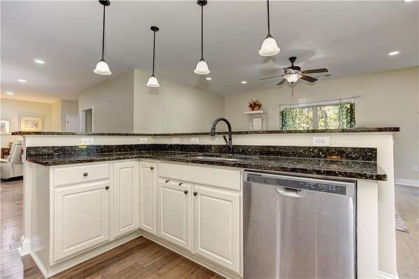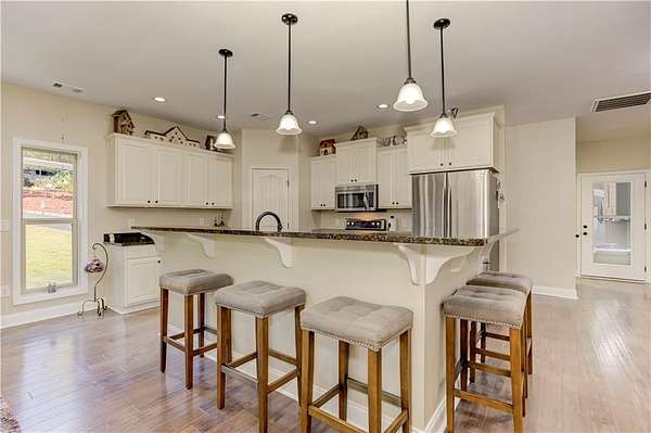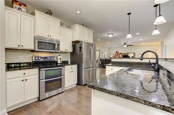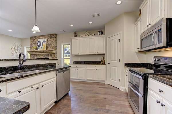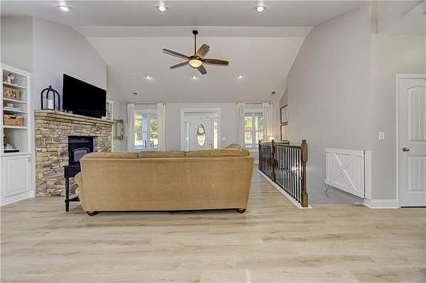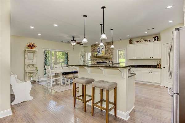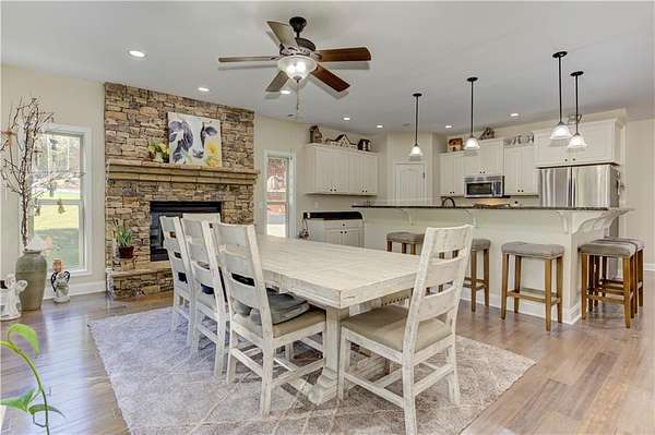 The rocking-chair front porch welcomes you into an open floor plan highlighted by a vaulted family room with a custom stone fireplace and wood-burning stove. The kitchen showcases granite countertops, stainless steel appliances, and rich cabinetry, while the dining area provides a perfect space for gatherings.