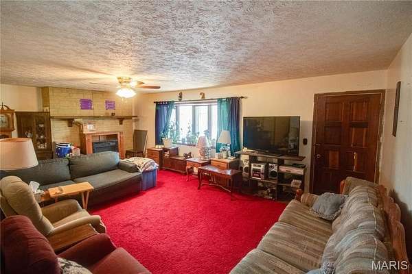 The residential structure is accessed by a gravel driveway and features an attached two-car garage and a chain-link fenced yard. Inside, the main level includes a spacious living room with a fireplace, a combined kitchen, dining, and laundry area.