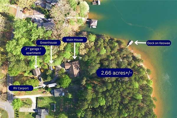 Beautiful 2.66 acre Lake Keowee waterfront home with 3200+ sqft and a 600+sqft guest apartment! Hidden from view down a curved driveway, you'll love the privacy this home enjoys. As you park, be sure to notice the greenhouse behind you, the perfect place to start your seedlings or create a tropical oasis to escape to on winter days. The main home features a peaceful courtyard out front, complete with pond, skylights over the front porch and sitting area with garden beds. Inside is a lovely foyer area and quick access to the study. The upstairs living area features cathedral ceilings, a stone fireplace, and loads of natural light through the recently upgraded sliding glass doors. A small sitting or dining area is also part of this space. Next is the kitchen, with a dedicated dining area, double ovens, plenty of countertop space and a home command center. The laundry and a half bath are just off the kitchen and lead to the 2-car garage. Next is the main floor primary suite. This oversized space features two closets, a balcony looking toward Lake Keowee, separate tub, lots of counterspace and it connects to the study just off the entry way. Head downstairs where you'll find a very large second living space (with brick fireplace), a bar area and full bath with a great set up for guests. Speaking of guests, they can choose from two guest rooms in the basement, one of which includes double closets and leads out onto the back patio. A heated and cooled workshop area with wash sink completes the downstairs. Detached from the house is a second two car garage, which includes an apartment above. The apartment includes a kitchen, dining/living area, bedroom with large closet and a bathroom. Access can be granted from both inside the garage and the back deck. The outside spaces at this home are incredible. Not only will you find expansive back decks, a large patio with both covered and uncovered area, you'll also find raised garden beds, loads of native plant species, well-manicured woods with walking trails, rip rap along the shoreline, a beach area when water levels are low and a dock in place. This lot is incredibly FLAT for the area and boasts loads of opportunity for enjoying those Lake Keowee views. This property is not located in an HOA and there are no known restrictions per sellers.
