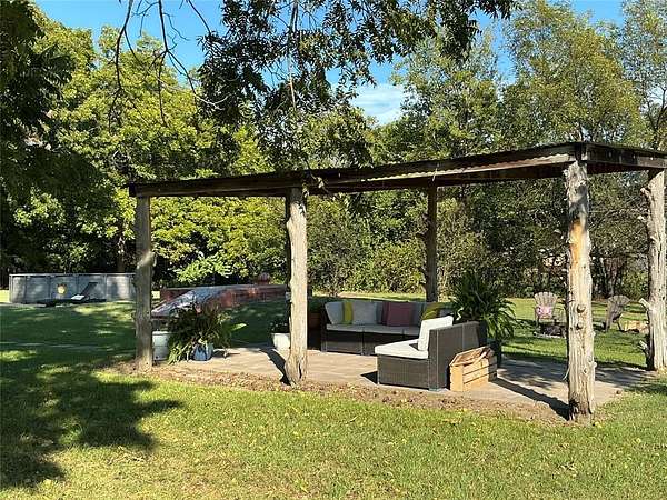The property's outdoor amenities provide safety and a relaxing atmosphere with the storm cellar, detached garage/ shop building, pergola, and a welcoming fire pit area. With three covered porches, there's always a shaded spot to relax.