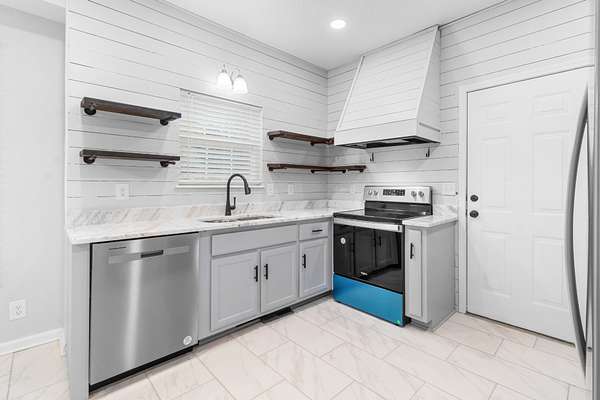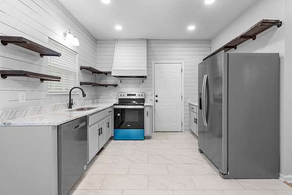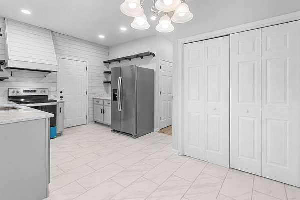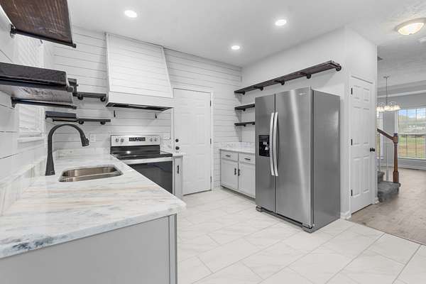 - Built-In Electric Range, Dishwasher, Disposal, Microwave, Refrigerator