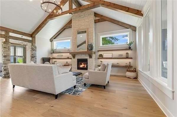 New construction Ranch estimated to be complete by the end of April, featuring over 1,800 sq ft on the main level plus approximately 1,600 sq ft finished below. Open and modern layout with vaulted ceilings and a stunning fireplace. This 4-bedroom, 3.5-bath home offers high-end finishes throughout, a large covered deck, and a dedicated theatre room. Situated on 3 acres with a pond at the end of a cul-de-sac, with ample space for an outbuilding. Huge suspended garage provides exceptional storage or future finished space. Grain Valley schools. **Pictures are renderings showing approximate layout and finishes. All finishes and colors are subject to change.