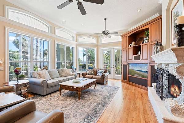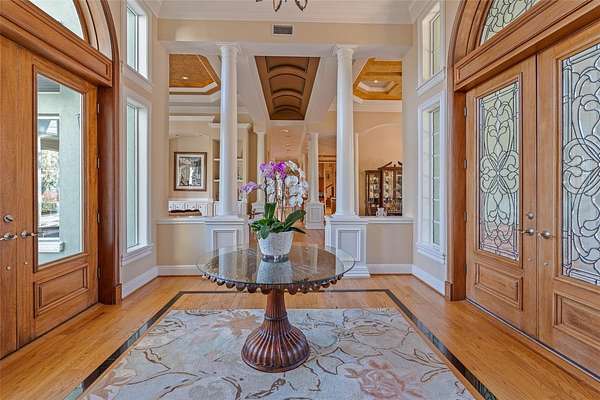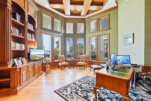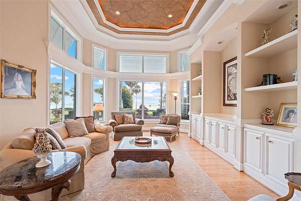 Inside the 8,596-square-foot custom residence, craftsmanship takes center stage. Walls of windows capture shimmering water views from nearly every room, while rich design details, from diagonal-laid hardwood floors and porcelain tile to tongue-and-groove, barrel, coffered, and tray ceilings, set an elegant tone. Handcrafted millwork, a stunning leaded glass entry, granite surfaces, multiple fireplaces, and upscale finishes add warmth and timeless appeal.