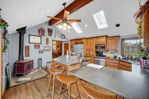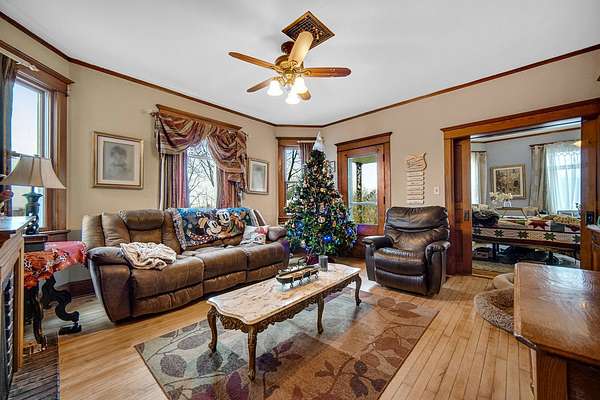 Beautifully updated historical farmhouse situated on 10 acres, offering a rare combination of character, modern improvements, and extensive outbuildings. A spacious and bright kitchen with a peninsula for gathering with sliding doors in 2022 leading out to new (2024) deck for entertaining and swimming in a new (2025) heated pool. If this isn't good enough, maybe you want to take a soak in the hot tub (negotiable) or move to the yard for a fire for the night. There is great space with a formal dining room with your beautiful built in china cabinet and your living room, enjoying more scenic views for all your holiday celebrations. Property also has about a half acre of orchard on it to enjoy fresh fruit like peaches, pears, apples, blueberries, and strawberries all summer long. The original barn on the back of the property was built in 1861 is 42' x 84' and holds endless possibilities. Two pole barns, one is 23'x34', the other is 43'x73'. Old corn crib 27' x 33' and small shed near house. Let's not forget the 4 car detached garage insulated and heated with one door having an opener which makes a great workshop. House upgrades include updated electric, updated plumbing, updated ductwork and furnace and A/C in 2023, whole house generator in 2020, geothermal heating system in 2021, new well pump in 2014, added bathroom in 2021, Driveway in 2021, Roof and siding in 2015. A truly special property offering space, history, functionality, and modern comfort-all in one remarkable setting.