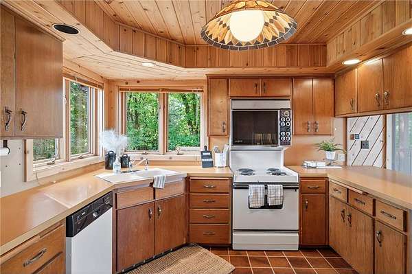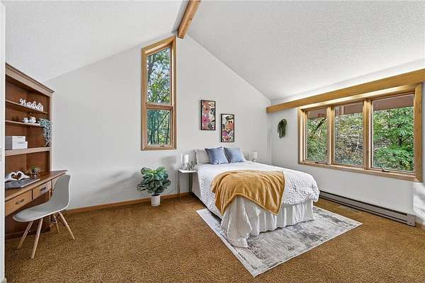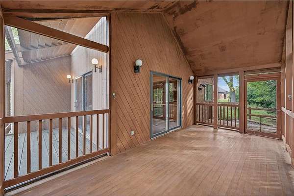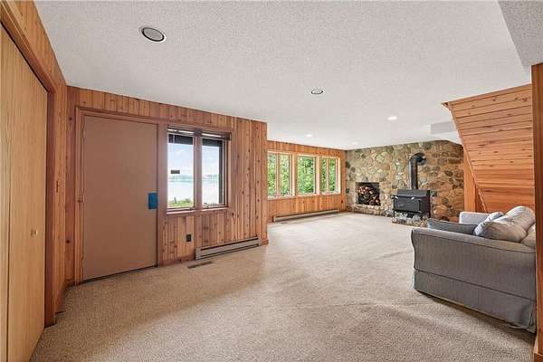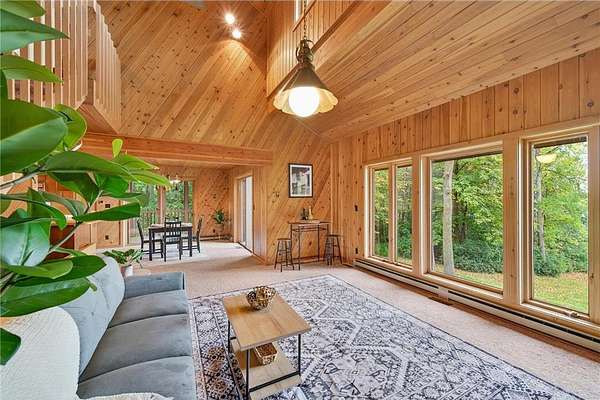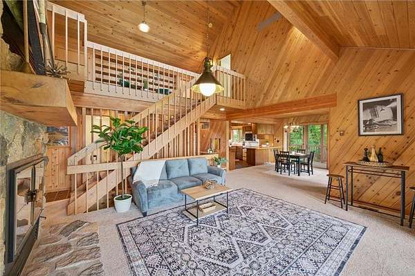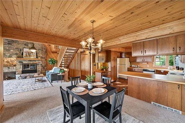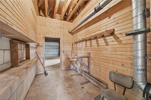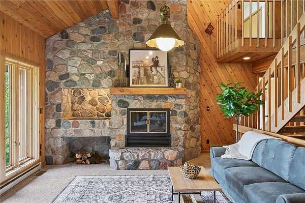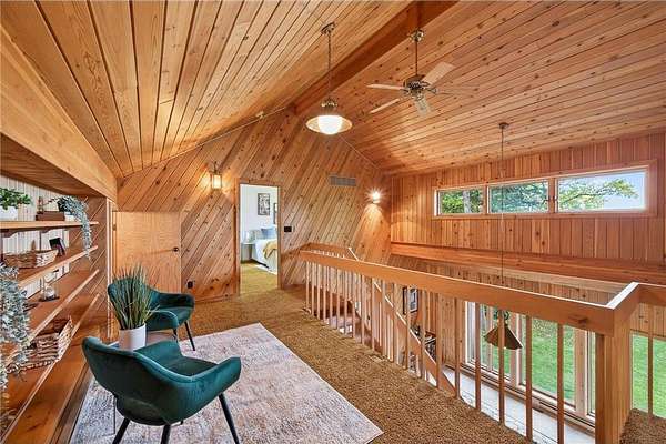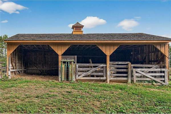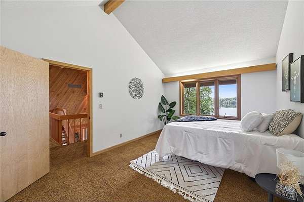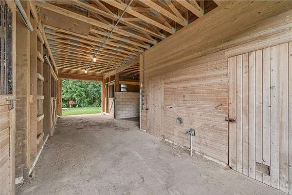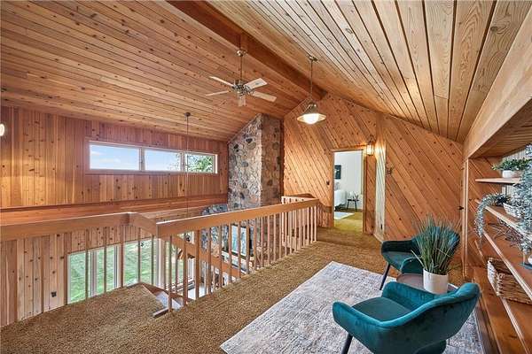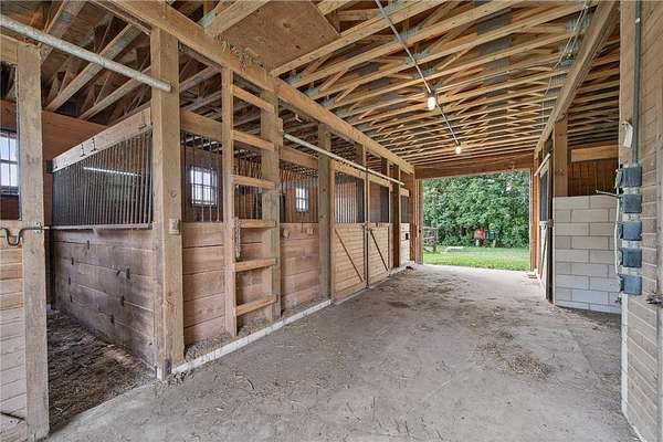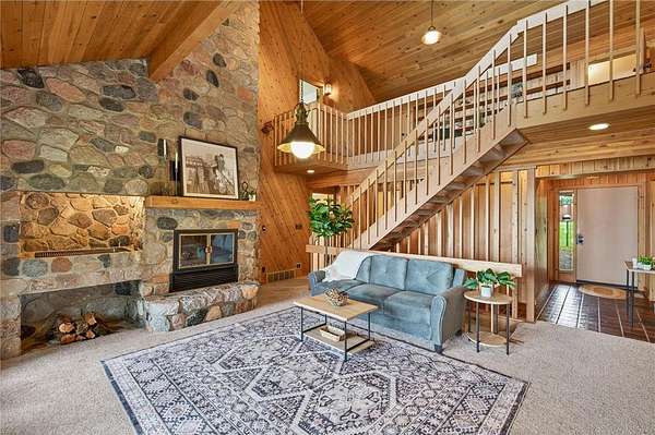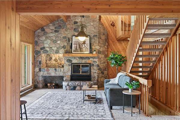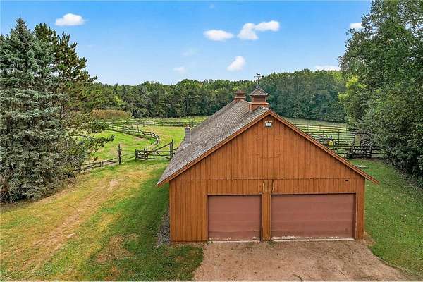 Inside, you'll immediately notice the artistry that sets this home apart. Knotty pine walls, tongue-and-groove ceilings, and open railings create a grand and welcoming atmosphere. Mid-century modern windows frame panoramic views of School Lake's natural beauty. The two-story stone hearth surrounding the wood-burning fireplace is truly a showpiece, and integrated lighting in the exposed beams highlights just how ahead of its time this design really is. The flexible layout is perfect for age-in-place living or accommodating multi-generational families, ensuring comfort and accessibility for every stage of life. The main level features a spacious primary bedroom with its own private deck, walk-in closet, and a private 3/4 bath. Upstairs, two generously sized bedrooms with vaulted ceilings are separated by a cozy loft with built-in bookshelves, offering lake views and a perfect spot to relax or read. The walk-out lower level adds even more versatility, with an additional bedroom, a family room with a wood burning stove, and a library or office space--ideal for book lovers, musicians, or as a fun game area. Outside, at the heart of the farm, stands a 2,353 sq ft barn, designed with every need in mind. Five spacious horse stalls, a dedicated horse shower, tack and feed rooms, and a walk-up attic for storage make daily chores efficient and enjoyable. The oversized three-car garage accommodates vehicles and trailers, while the 40 x 23 open shelter behind the barn keeps livestock content and protected, no matter the season. This property is a haven for both horse and cattle enthusiasts. The varied landscape helps with pasture rotation, protecting the land's health and keeping your animals happy with plenty of grazing options. Blaze your own trails for riding or skiing, set out boating on the lake, or create the garden of your dreams--all without leaving your land.