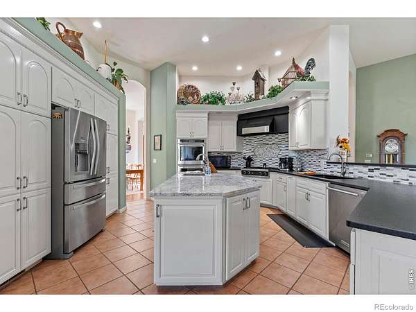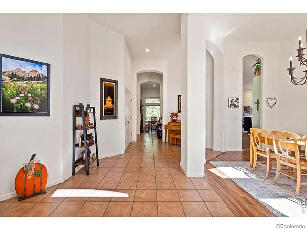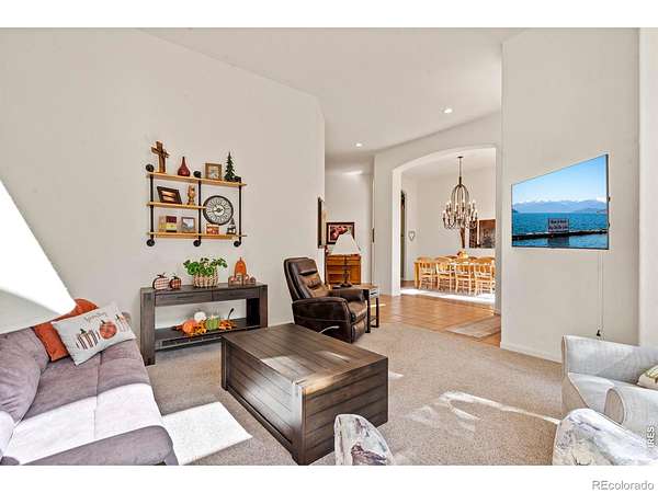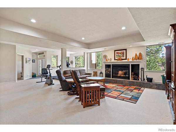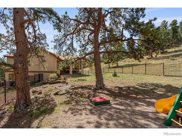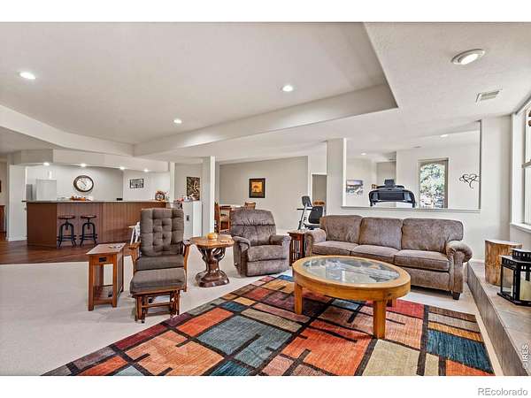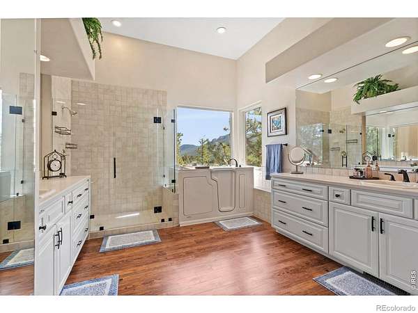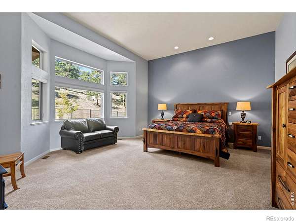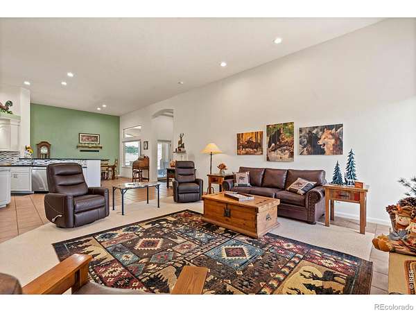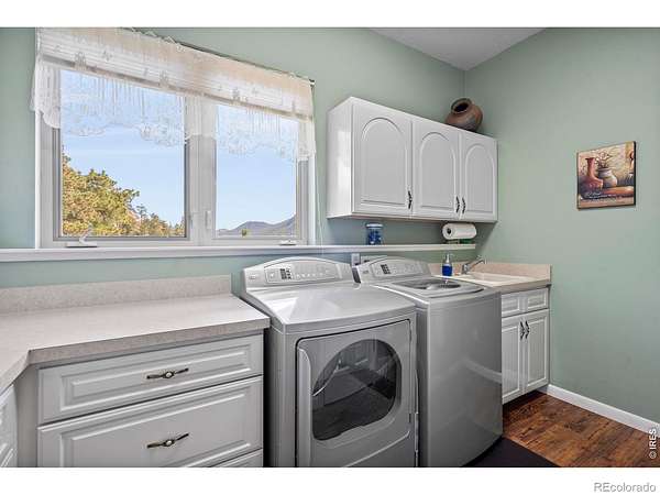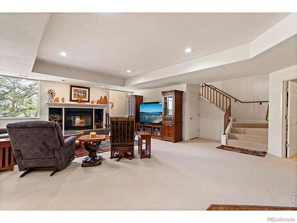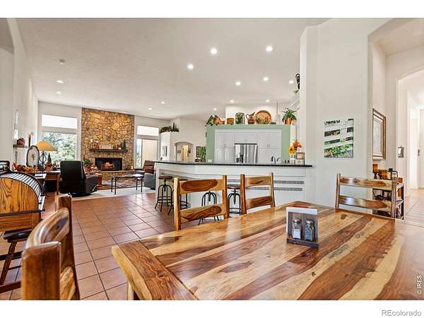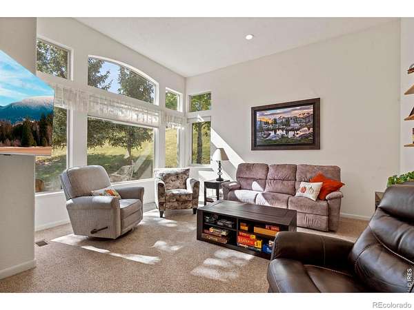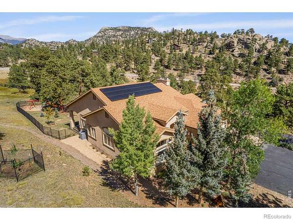 Mountain Luxury Meets Modern Efficiency in this stunning 4,474 sq ft home set on 1.94 private acres with paid-in-full solar. Tucked at the end of a quiet cul-de-sac just minutes from downtown Estes Park, this property offers the perfect blend of privacy, convenience, and thoughtfully updated living. Featuring 4 bedrooms plus a dedicated office or flex space, 3 bathrooms, a walkout basement with a bar, and a 3-car heated garage, the home is designed for both comfort and versatility. Surrounded by nearly 2 acres of natural beauty, you'll enjoy peaceful seclusion with frequent elk sightings right outside your door. From the moment you arrive, the stone-accented exterior and refreshed landscaping make a striking impression. Inside, soaring 12-foot ceilings and expansive windows fill the home with natural light while showcasing breathtaking mountain views. The great room centers around a dramatic stone-wrapped high-efficiency gas fireplace, creating a warm, inviting space ideal for relaxing or entertaining. The open-concept layout flows into a beautifully updated kitchen with brand-new countertops, backsplash, sinks, and faucets. Just beyond, the dining area features stylish LVP flooring and modern LED lighting-perfect for hosting gatherings both large and small. The primary suite serves as a private retreat, complete with new carpeting, updated shades, and a fully reimagined bathroom featuring a walk-in tub, new shower enclosure, and updated flooring. Additional bedrooms, a flexible office space, and a fully finished walkout basement with a bar and wood-burning fireplace offer exceptional flexibility for entertaining or multi-generational living. Step outside to enjoy the expansive 1.94-acre lot, enhanced by new landscaping, hardscape, a fenced yard, and serene surroundings. With dual furnaces, a radon mitigation system, and energy-efficient solar, this home delivers comfort, efficiency, and peace of mind.