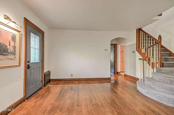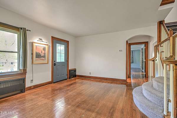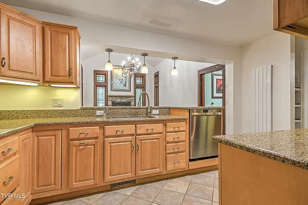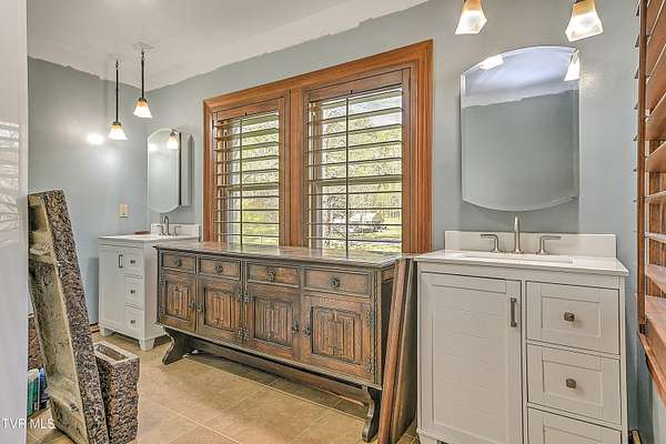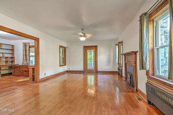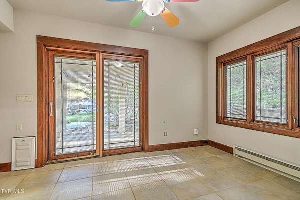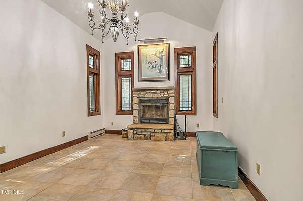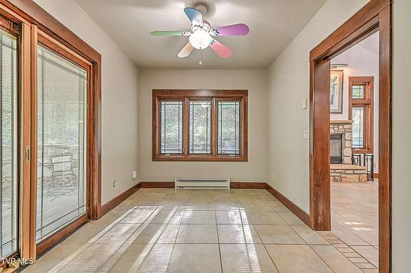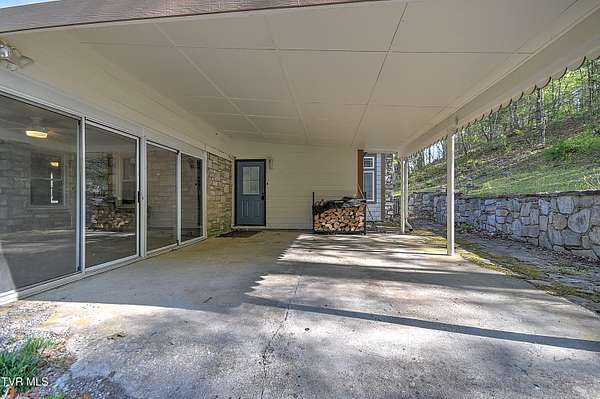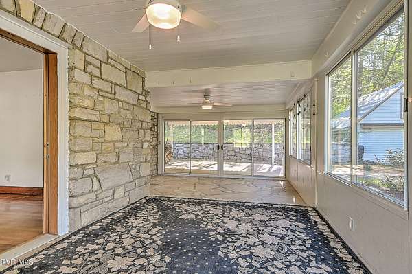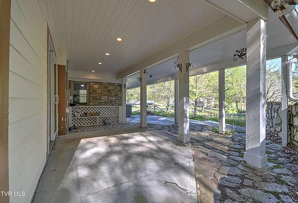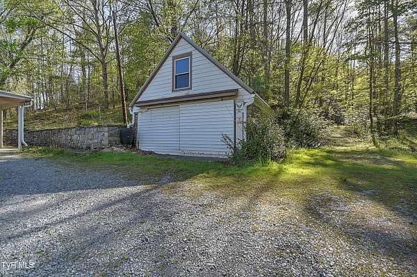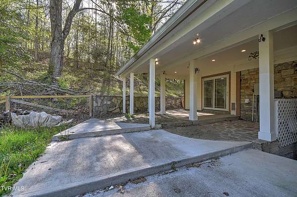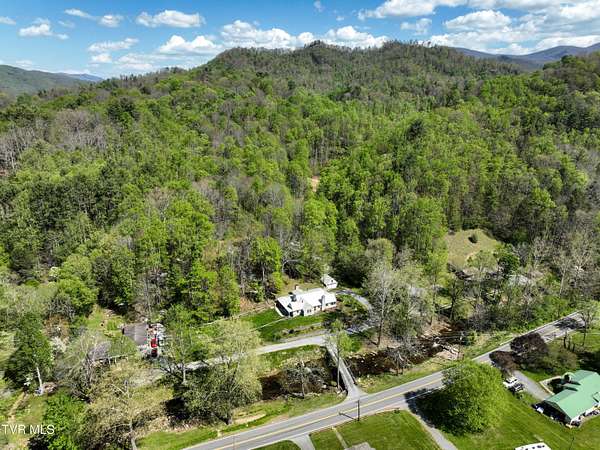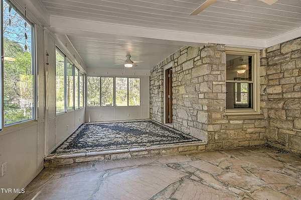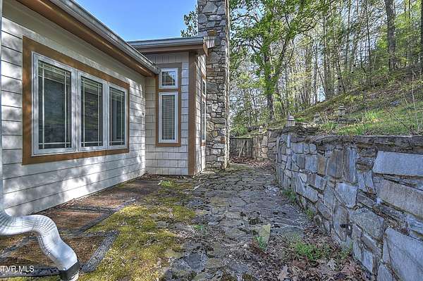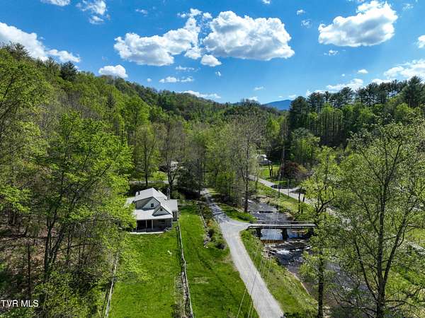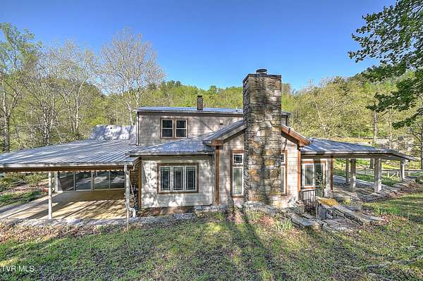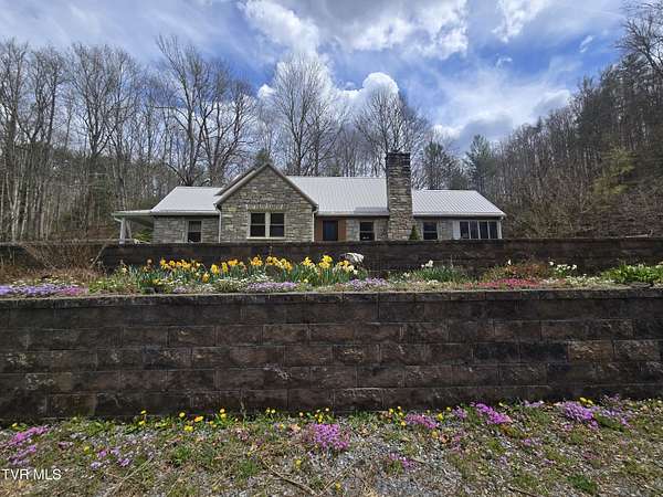 Welcome to this beautifully crafted stone home perched just above the Doe River on Hwy 143 in Roan Mountain, TN. Thoughtfully designed and rich with character, this property offers a rare blend of mountain charm, quality construction, and spacious living--set on more than 9 acres of wooded privacy. A terraced flower garden frames the front of the home, offering seasonal color and a welcoming first impression. Enter through the carport into a convenient mud room, then step into the stunning dining room featuring a vaulted ceiling, stone fireplace, and abundant natural light. Hidden doors allow you to create a private dining space when desired. The well appointed kitchen includes custom birch cabinetry with soft close drawers, generous storage, granite countertops, and excellent workspace for the home cook. Just beyond, a large flex room with built in shelving and desk areas provides an ideal office, study, or library. The great room offers access to the sun porch, front entry, half bath, and the main level primary suite. A second fireplace with insert adds warmth and ambiance. The spacious primary bedroom connects to an updated ensuite bath with a large walk in shower, heated towel rack, dual sinks, and an expansive vanity. Upstairs are two additional large bedrooms and a full bath, with original glass doorknobs and mortise locks that reflect the home's 1946 heritage. Outdoor living shines with extensive stonework, a large patio with stately wooden columns, and multiple terraced areas perfect for entertaining or quiet relaxation. The 9+ acre property offers wooded trails, natural beauty, and the feeling of a private mountain retreat. Come experience this unique Roan Mountain property--your own mountain ''castle'' ready to welcome you home.