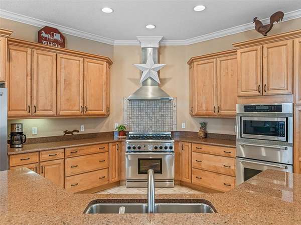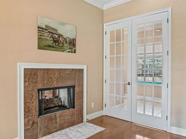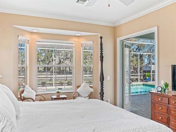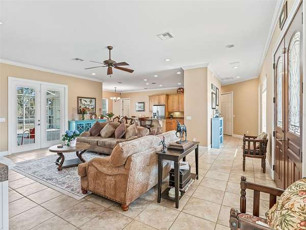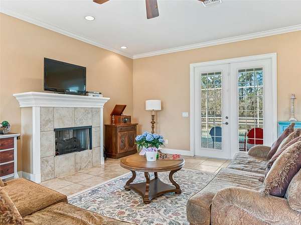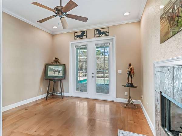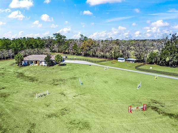 Fantastic 5+ acre horse property well located on a quiet country road just a stones throw away from the World Equestrian Center Ocala! The custom built home is concrete block construction with 4 beds, 4 bathrooms & a large screened-in pool & the property boasts a 2-stall barn, 2 grass paddocks, & grass jumping field. The property is accessed through a gated entrance & asphalt paved driveway which leads past the jumping field to the home & 2-car garage. The house interior has many high-end features such as 10' ceilings throughout, 8' tall interior doors, all tile & wood flooring, crown molding, & French doors. The living room boasts a double sided gas fireplace with French doors opening to the covered screen-in pool area. The kitchen has a large quartz island, stainless appliances & gas oven- cooktop. The primary bedroom has wood flooring, is over-sized with direct access to the pool, dual walk-in closets, & ensuite 5-piece bathroom. The 2nd bedroom also has a full en-suite bathroom & walk-in closet. There is also a Generac whole house gas generator with 500 gallon propane tank & well water softener system & the entire property is fenced & ready for you to move in!